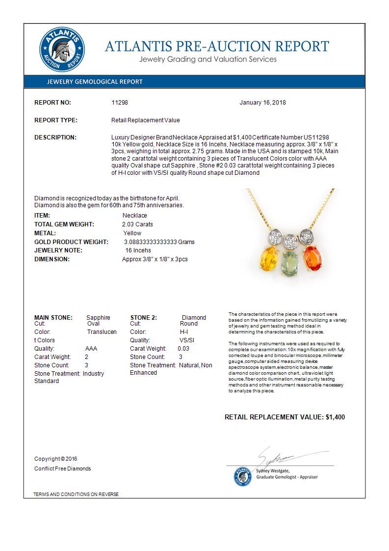 REF-21W5F -11298 ---- 2.03 CTW Multi-Sapphire & Diamond Necklace 10K Yellow Gold ---- Luxury Designer Brand Necklace Appraised at $1,400 Certificate Number US11298 10k Yellow gold, Necklace Size is 16 Incehs, Necklace measuring approx. 3/8" x 1/8" x 3pcs, weighing in total approx. 2.75 grams. Made in the USA and is stamped 10k, Main stone 2 carat total weight containing 3 pieces of Translucent Colors color with AAA quality Oval shape cut Sapphire , Stone #2 0.03 carat total weight containing 3 pieces of H-I color with VS/SI quality Round shape cut Diamond