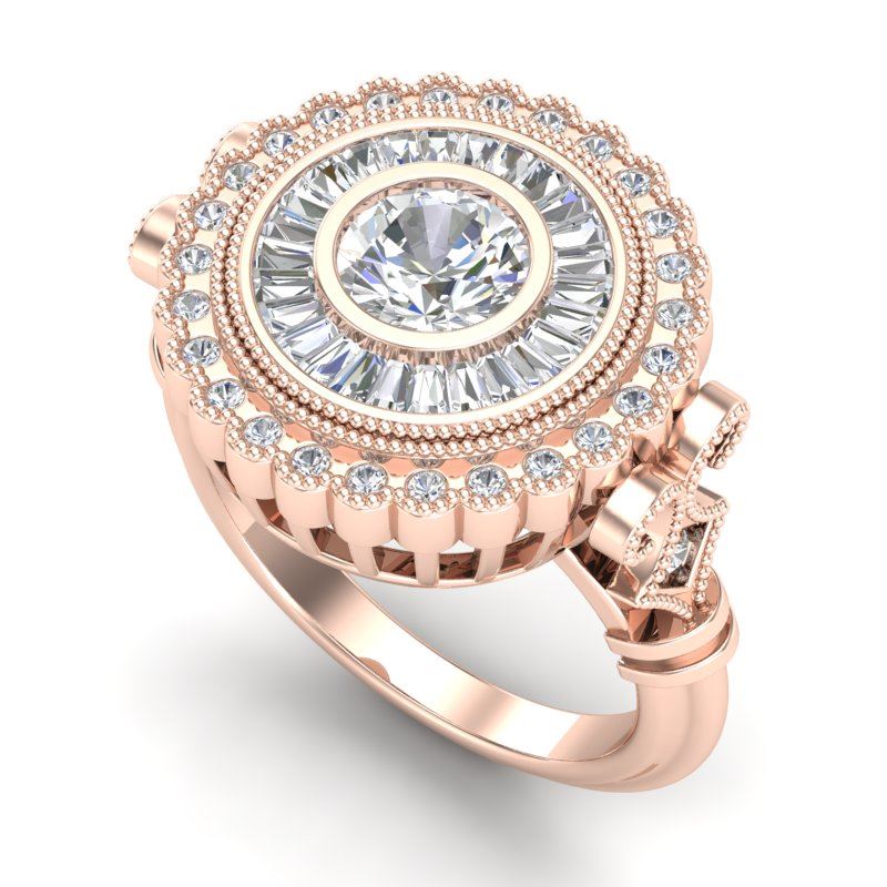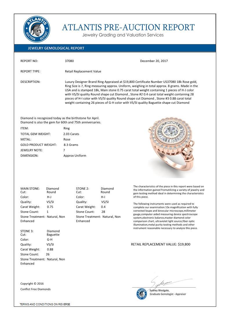 REF-327W3F -37080 ---- 2.03 CTW VS/SI Diamond Solitaire Art Deco Ring 18K Rose Gold ---- Luxury Designer Brand Ring Appraised at $19,800 Certificate Number US37080 18k Rose gold, Ring Size is 7, Ring measuring approx. Uniform, weighing in total approx. 8 grams. Made in the USA and is stamped 18k, Main stone 0.75 carat total weight containing 1 pieces of H-J color with VS/SI quality Round shape cut Diamond , Stone #2 0.4 carat total weight containing 28 pieces of H-I color with VS/SI quality Round shape cut Diamond , Stone #3 0.88 carat total weight containing 26 pieces of G-H color with VS/SI quality Baguette shape cut Diamond