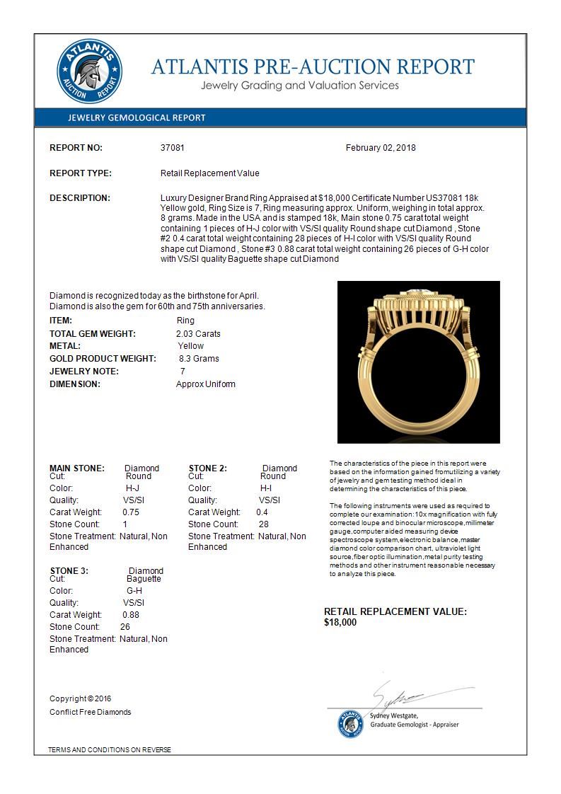 REF-270M2H -37081 ---- 2.03 CTW VS/SI Diamond Solitaire Art Deco Ring 18K Yellow Gold ---- Luxury Designer Brand Ring Appraised at $18,000 Certificate Number US37081 18k Yellow gold, Ring Size is 7, Ring measuring approx. Uniform, weighing in total approx. 8 grams. Made in the USA and is stamped 18k, Main stone 0.75 carat total weight containing 1 pieces of H-J color with VS/SI quality Round shape cut Diamond , Stone #2 0.4 carat total weight containing 28 pieces of H-I color with VS/SI quality Round shape cut Diamond , Stone #3 0.88 carat total weight containing 26 pieces of G-H color with VS/SI quality Baguette shape cut Diamond