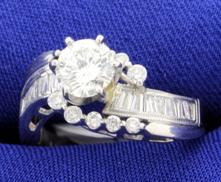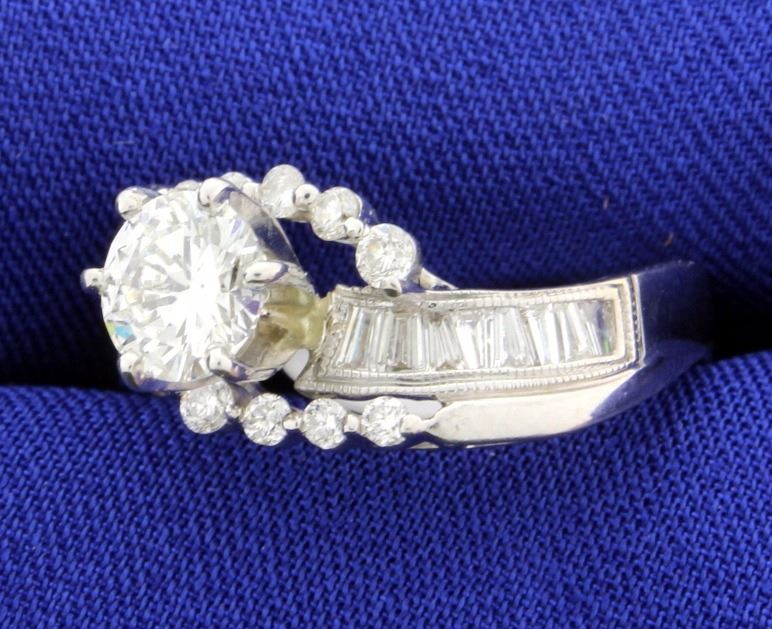 Beautiful 2.03 carat diamond ring set in 14k white gold. The center diamond is 1.03 carats, SI1 clarity and I color. There is 1.00 carats of brilliant cut diamonds and tapered baguette's, clarity SI and color G-H-I. This is a very big look with very bright and white diamonds!! Size 7 3/4 5.5g
