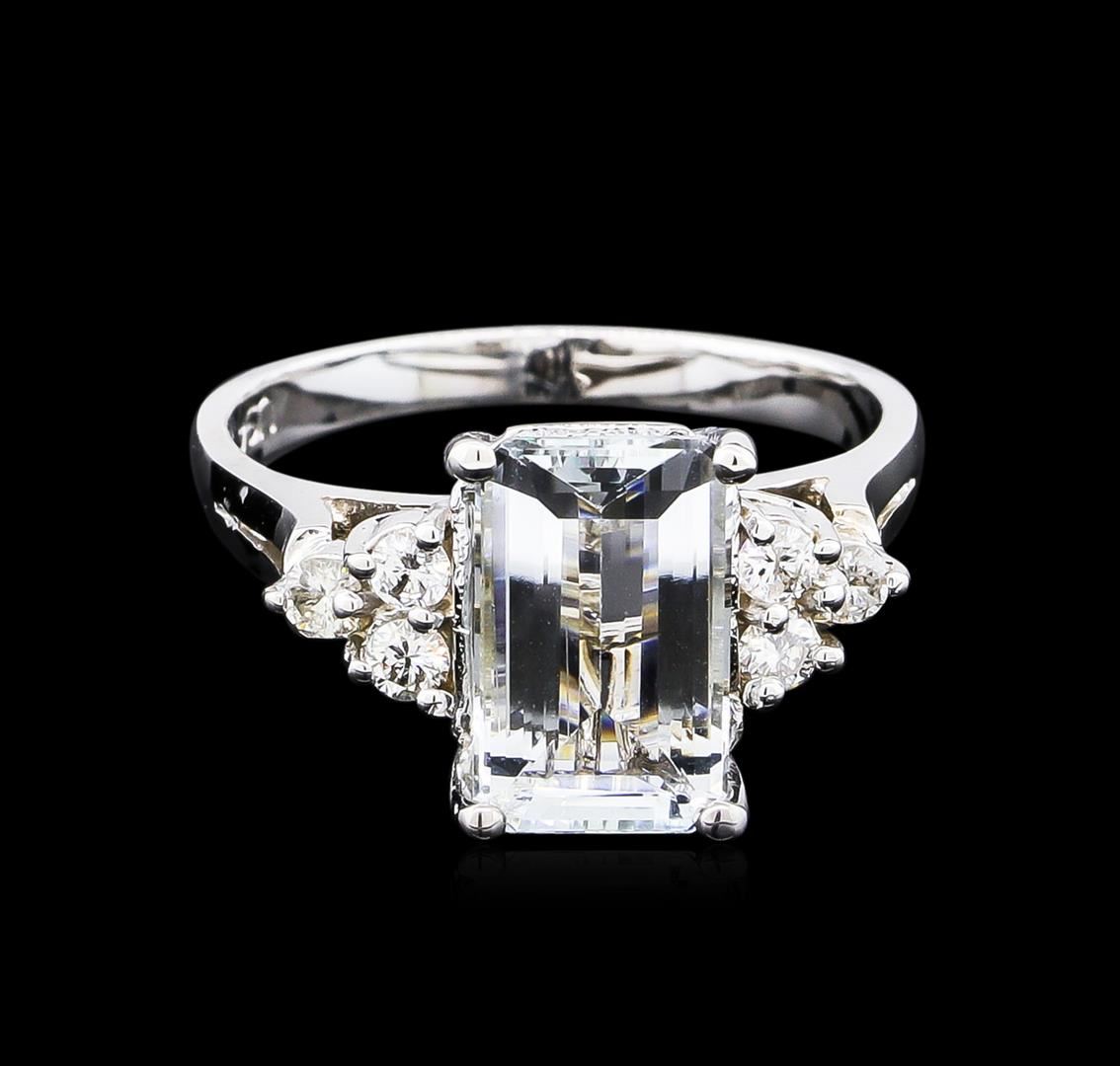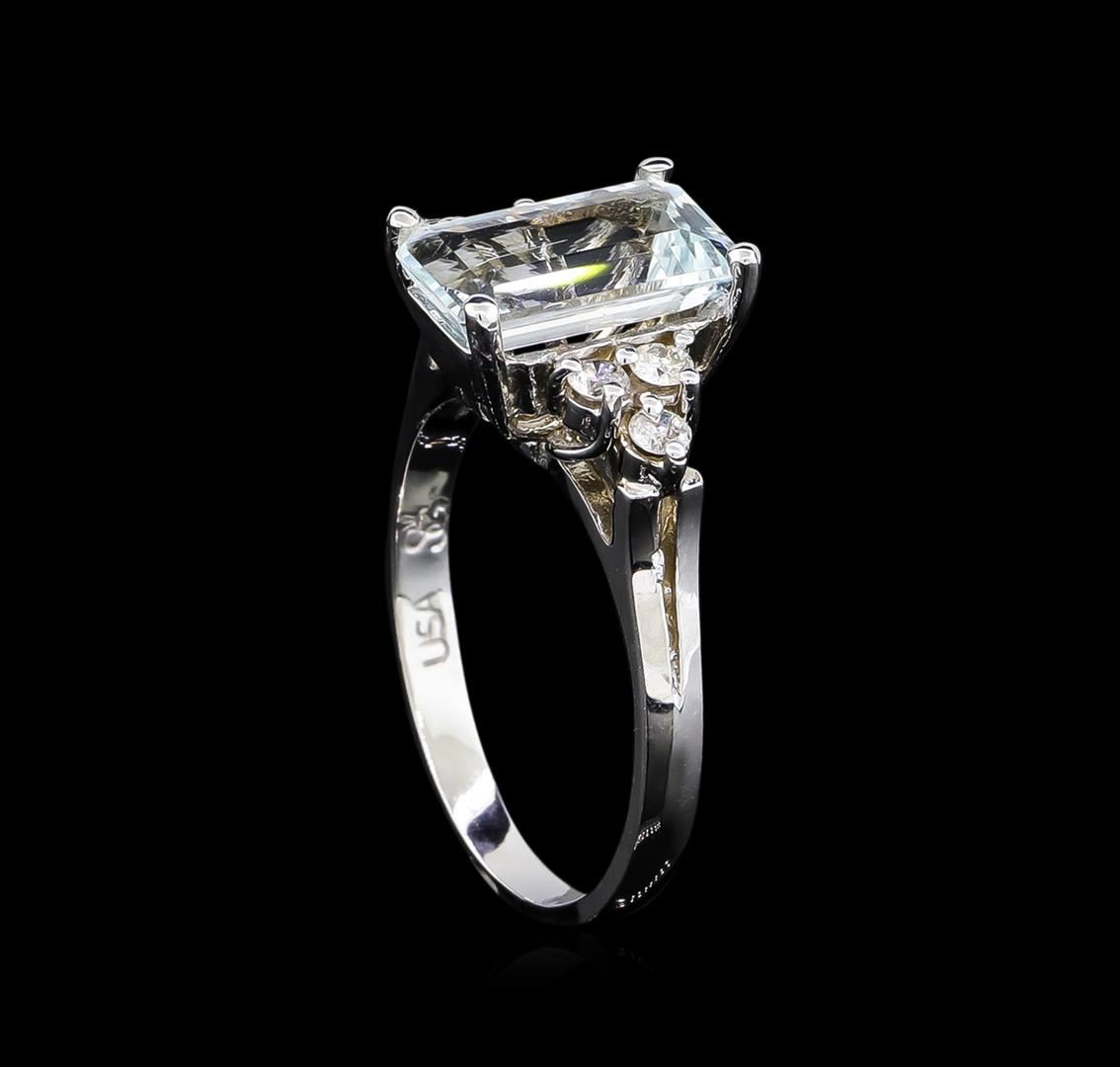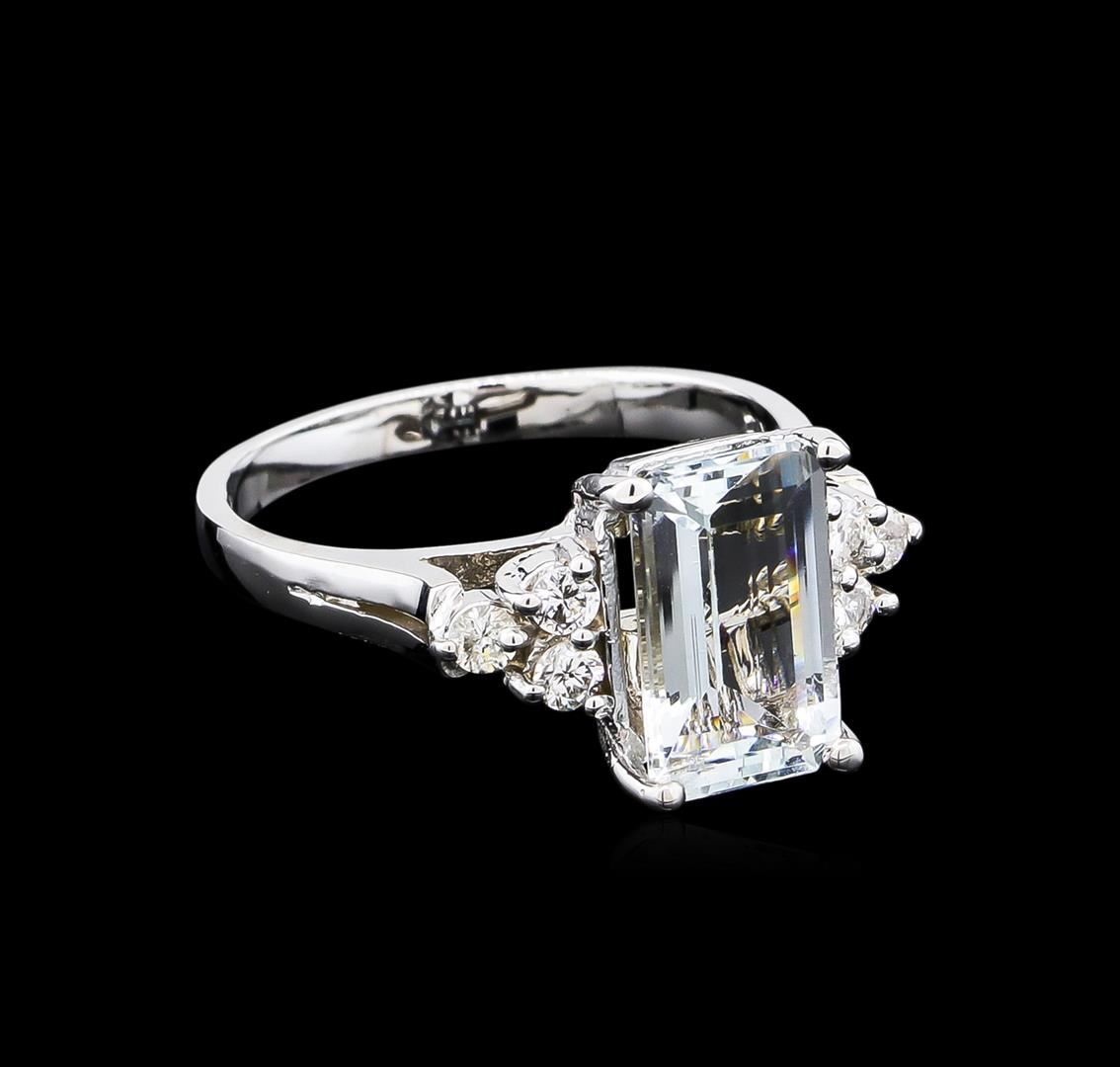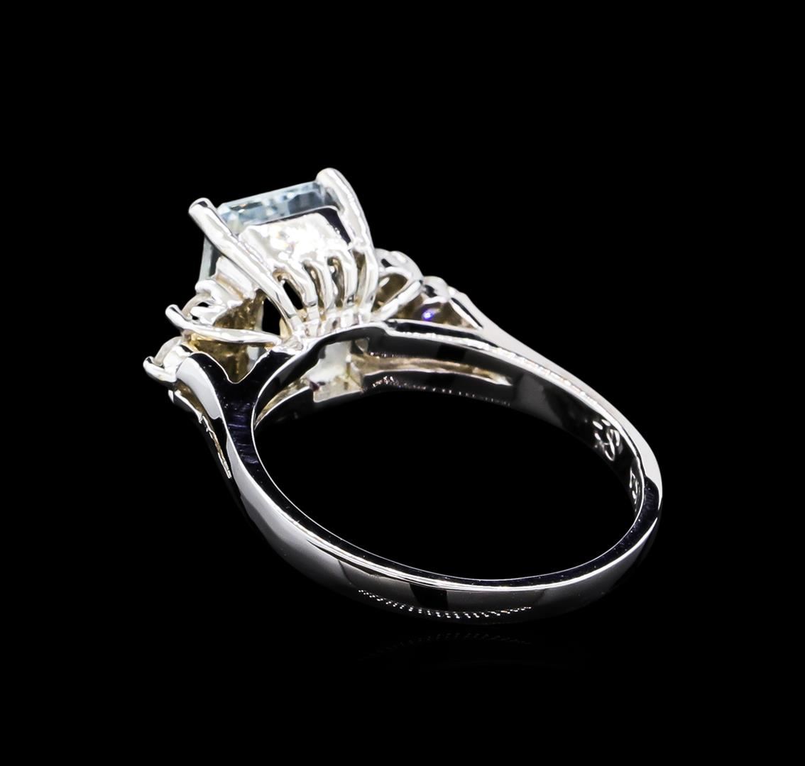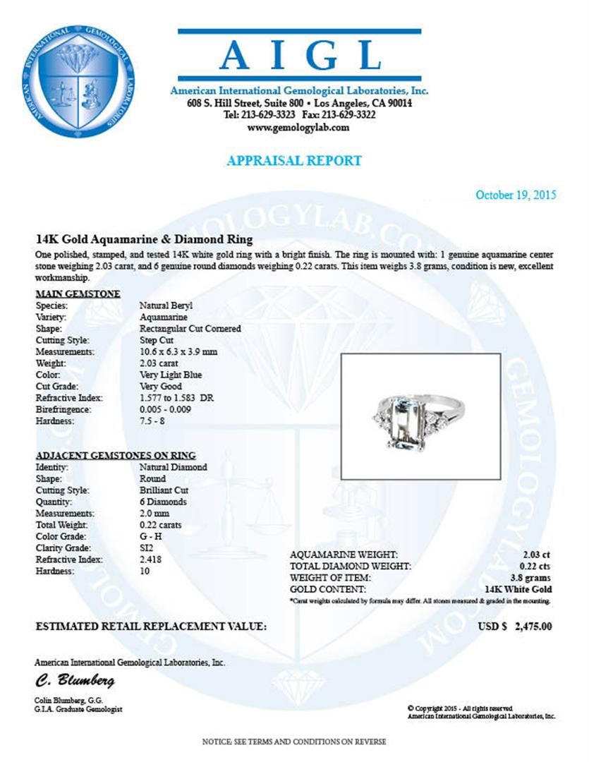 One polished, stamped, and tested 14KT white gold ring with a bright polish finish. The ring is mounted with: 1 genuine aquamarine center stone weighing 2.03ct, and 6 genuine round diamonds weighing 0.22ct. This item weighs 3.80 grams, condition is new, excellent workmanship. MAIN GEMTONE: Species: Natural Beryl. Variety: Aquamarine. Shape: Rectangular cut cornered. Cutting Style: Step cut. Measurements: 10.6 x6.3 x 3.9 mm. Weight: 2.03ct. Color: Very light blue. Cut Grade: Very good. Refractive Index: 1.577 to 1.583 DR. Birefringence: 0.005 - 0.009. Hardness: 7.5 - 8. ADJACENT GEMSTONES ON RING: Identity: Natural Diamond. Shape: Round. Cutting Style: Brilliant cut. Quantity: 6 diamonds. Measurements: 2.00 mm. Total Weight: 0.22ct. Color Grad: G - H. Clarity Grade: SI2. Refractive Index: 2.418. Hardness: 10. AIGL Appraised at $2,475.00.