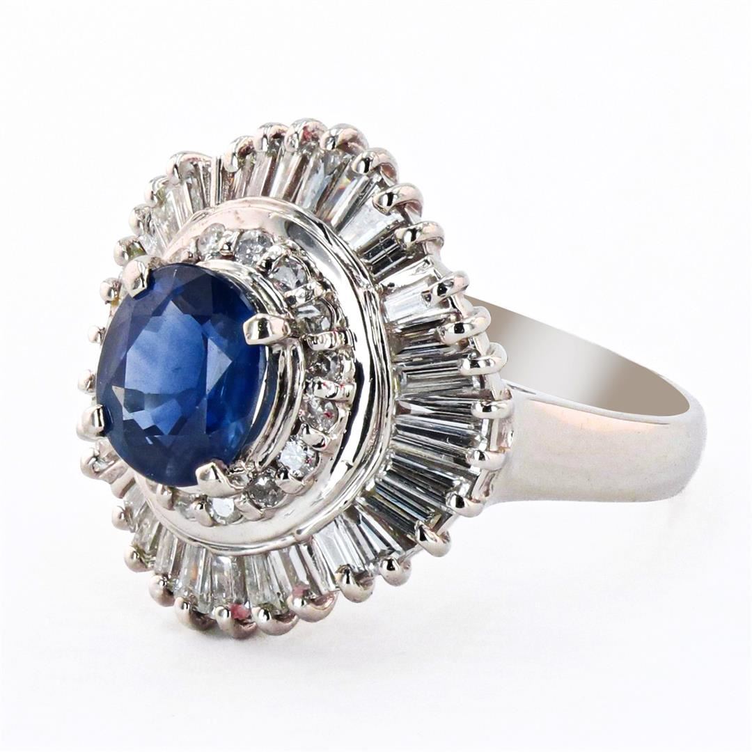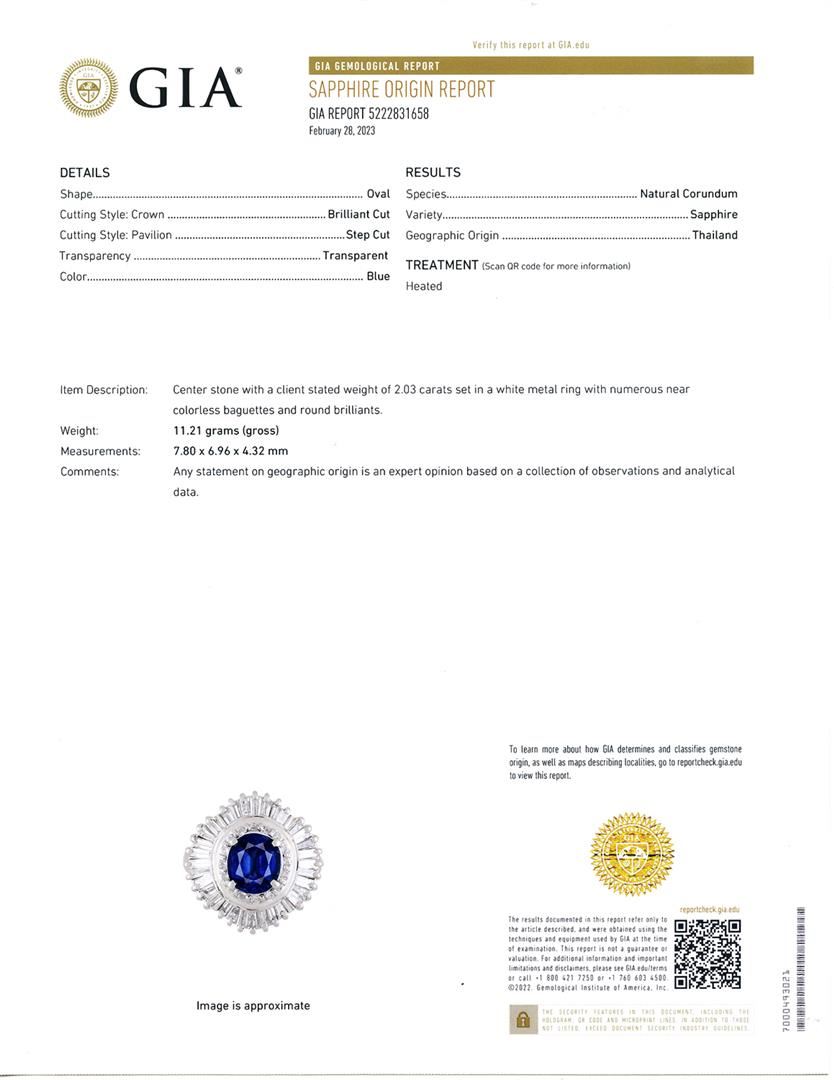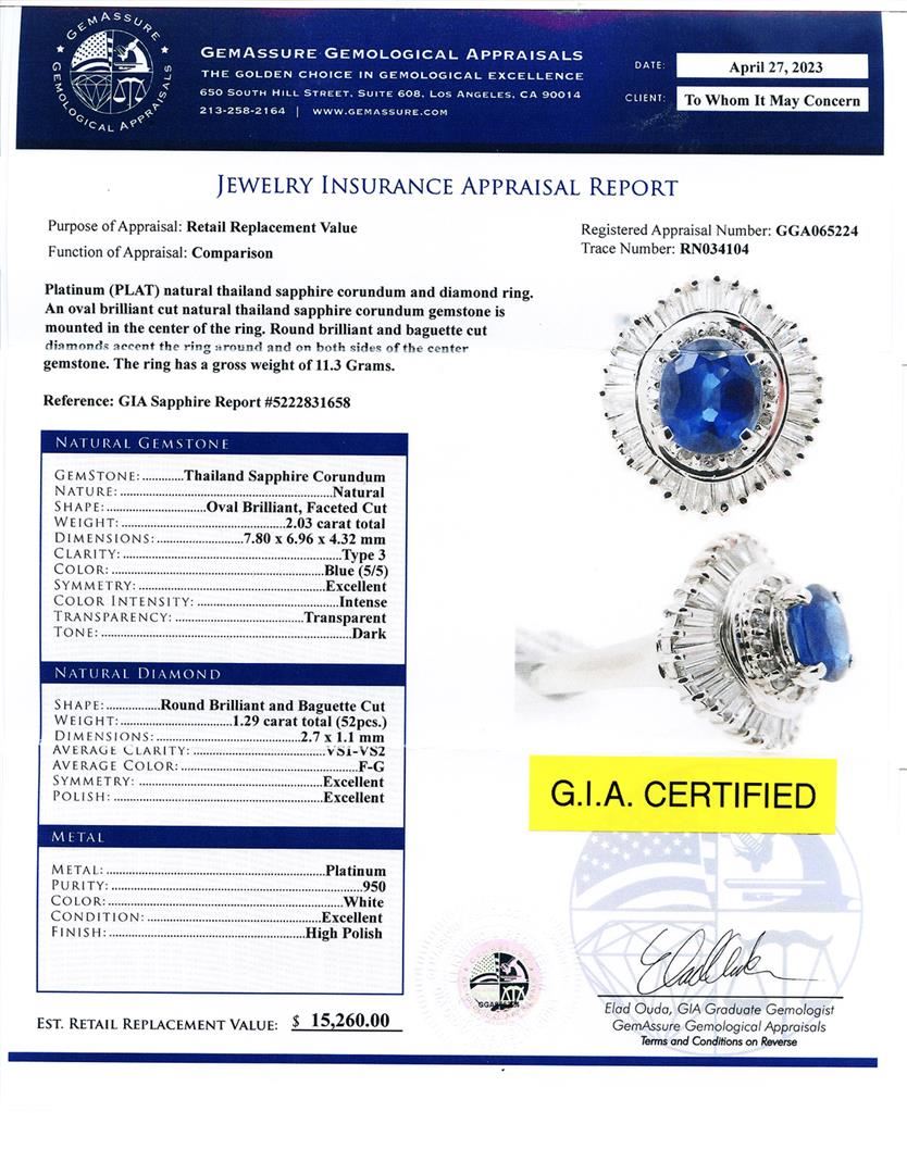 2.03ct Blue Sapphire and 1.29ctw Diamond Platinum Ring (GIA CERTIFIED). Platinum (PLAT) natural thailand sapphire corundum and diamond ring. An oval brilliant cut natural thailand sapphire corundum gemstone is mounted in the center of the ring. Round brilliant and baguette cut diamonds accent the ring around and on both sides of the center gemstone. The ring has a gross weight of 11.3 Grams. Reference: GIA Sapphire Report 5222831658 NATURAL GEMSTONE GEMSTONE: Thailand Sapphire Corundum NATURE: Natural SHAPE: Oval Brilliant, Faceted Cut WEIGHT: 2.03 carat total DIMENSIONS: 7.80 x 6.96 x 4.32mm CLARITY: Type 3 COLOR: Blue (5/5) SYMMETRY: Excellent COLOR INTENSITY: Intense TRANSPARENCY: Transparent TONE: Dark NATURAL DIAMOND SHAPE: Round Brilliant and Baguette Cut WEIGHT: 1.29 carat total (52pcs.) DIMENSIONS: 2.7 x 1.1mm AVERAGE CLARITY: VS1-VS2 AVERAGE COLOR: F-G SYMMETRY: Excellent POLISH: Excellent METAL METAL: Platinum PURITY: 950 COLOR: White CONDITION: Excellent FINISH: High Polish