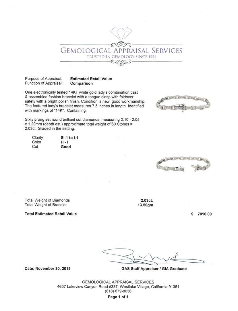 One electronically tested 14KT white gold lady's combination cast & assembled fashion bracelet with a tongue clasp with foldover safety with a bright polish finish. The featured lady's bracelet measures 7.5 inches in length. Identified with markings of "14K". Condition is new, good workmanship. Containing: Sixty prong set round brilliant cut diamonds, measuring 2.10 - 2.05 x 1.29mm (depth est.) approximate total weight of 60 Stones = 2.03ct. Graded in the setting. Clarity: SI-1 to I-1 . Color: H - I. Cut Good. Total Weight of Diamonds 2.03ct.. Total Weight of Bracelet 13.50gm at $ 7010.00 GAS Appraised.