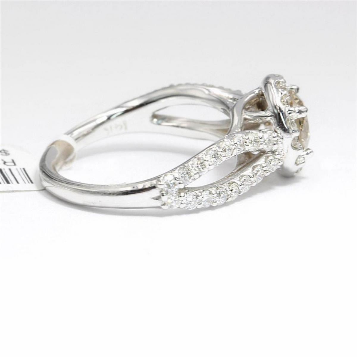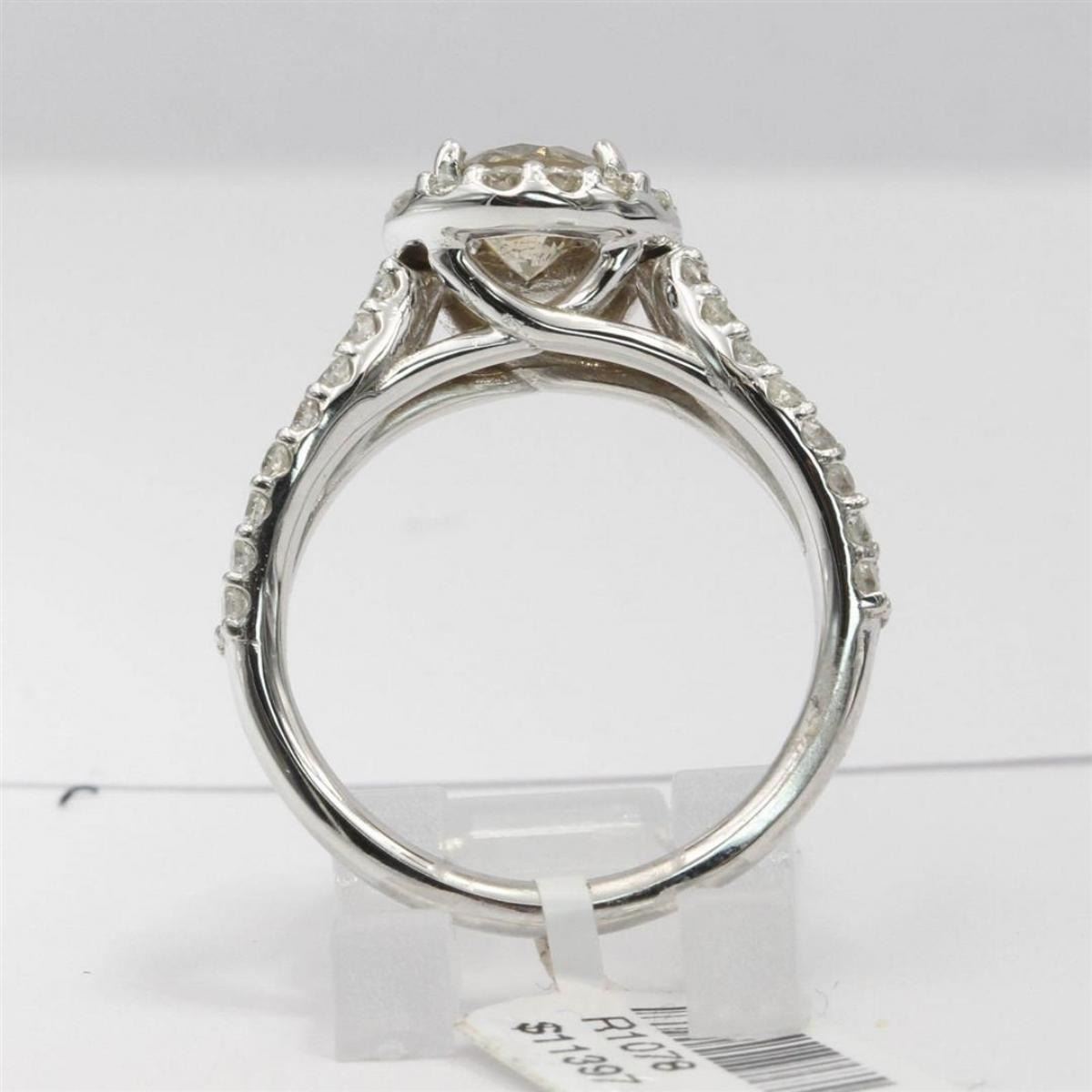 One lady's wedding ring featuring: 14KT white gold weighing 4.95 grams containing one center diamond with a weight of 1.04ct and 46 side diamonds weighing 0.99ctw. The center diamond is round brilliant cut with SI2 clarity, fancy brown color and excellent cut. The side diamonds are round brilliant cut with SI clarity and G-H color with excellent cut. The ring is a size 6.5 but can be resized.