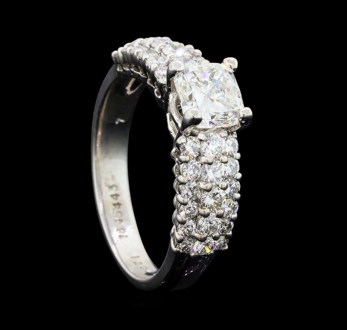 One electronically tested 18KT white gold lady's cast wedding ring with a three row cathedral shank with a bright polish finish. The featured lady's ring has a shank measuring 3.13 millimeters wide. Identified with markings of '18K 750'. Condition is new, good workmanship. Containing: One prong set cushion cut diamond, measuring 6.05 x 5.80 x 3.91mm (depth est.) approximate weight of 1.01ct. Graded loose prior to setting in the EGL Laboratory, Report #US81496232D. Color D Clarity SI-2 Cut Good Ten prong set round brilliant cut diamonds, measuring 2.30 - 2.20 x 1.40mm (depth est.) approximate total weight of 10 Stones = 0.44ct. Graded in the setting. Color G - H Clarity VS-1 to VS-2 Cut Excellent Twenty-Four prong set round brilliant cut diamonds, measuring 1.90 - 1.80 x 1.15mm (depth est.) approximate total weight of 24 Stones = 0.58ct. Graded in the setting. Color G - H Clarity VS-1 to VS-2 Cut Excellent. Total Weight of Diamonds 2.03ct.. Total Weight of Ring 5.60gm GAS Appraised at $14385.00. GAS Appraised at $14,385.00.