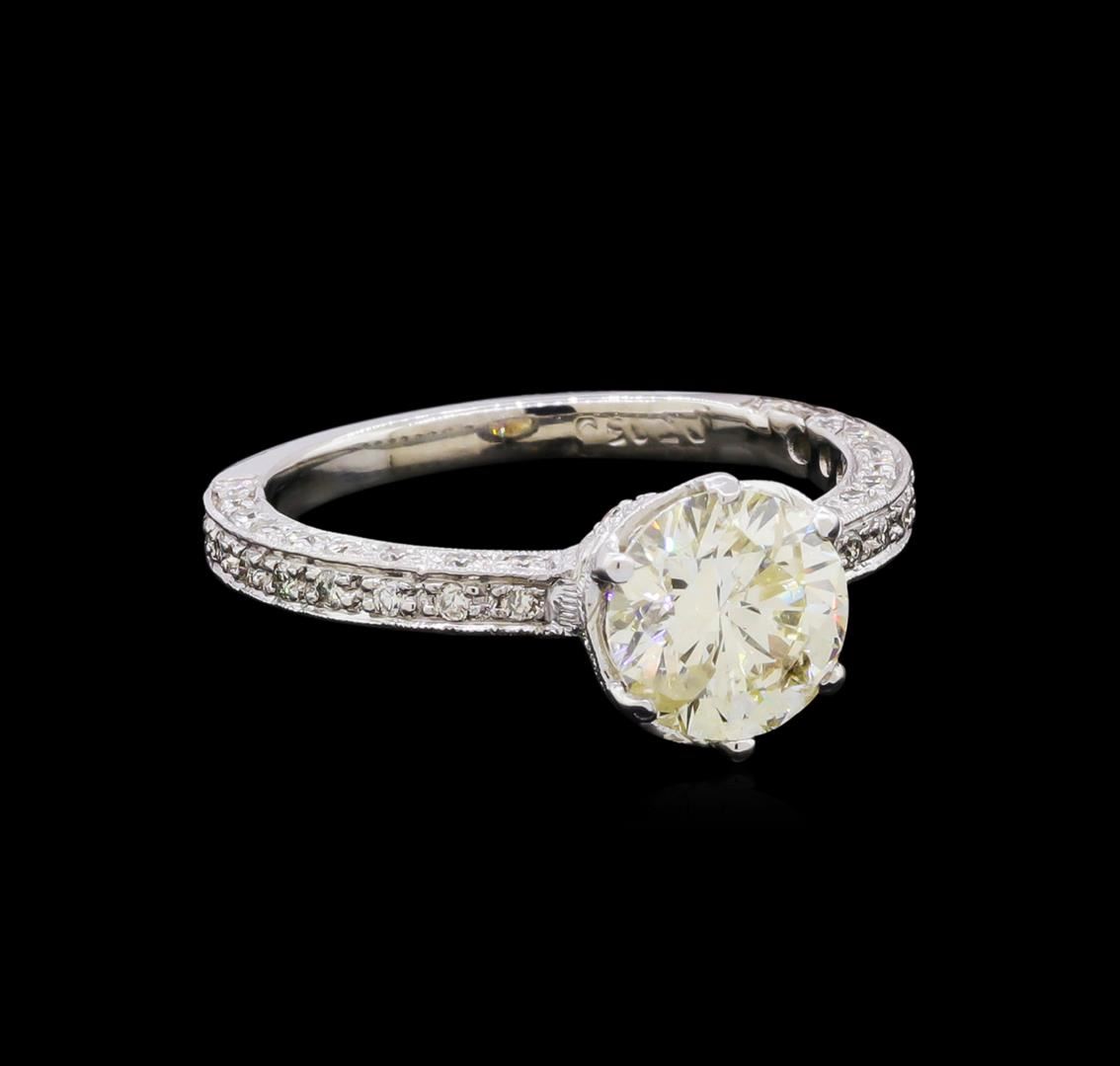 One electronically tested platinum lady's cast wedding ring with a cathedral shank with a bright polish with milgrain detailing finish. The featured lady's ring has a shank measuring 1.96 millimeters wide. Identified with markings of "PT 950". Condition is new, good workmanship. Containing: One prong set round brilliant cut diamond, measuring 7.24 - 7.23 x 4.55mm (depth est.) , 5.00.%. GTCF approximate weight of 1.53ct. Graded in the setting. Clarity: I-1. Color: J. Cut Very Good Seventy-Two prong set round brilliant cut diamonds, measuring 1.25 - 1.15 x 0.74mm (depth est.) approximate total weight of 72 Stones = 0.50ct. Graded in the setting. Clarity: VS-2 to SI-2. Color: F - Good. Total Weight of Diamonds 2.03ct. Total Weight of Ring 4.80gm GAS Appraised at $15,240.00.