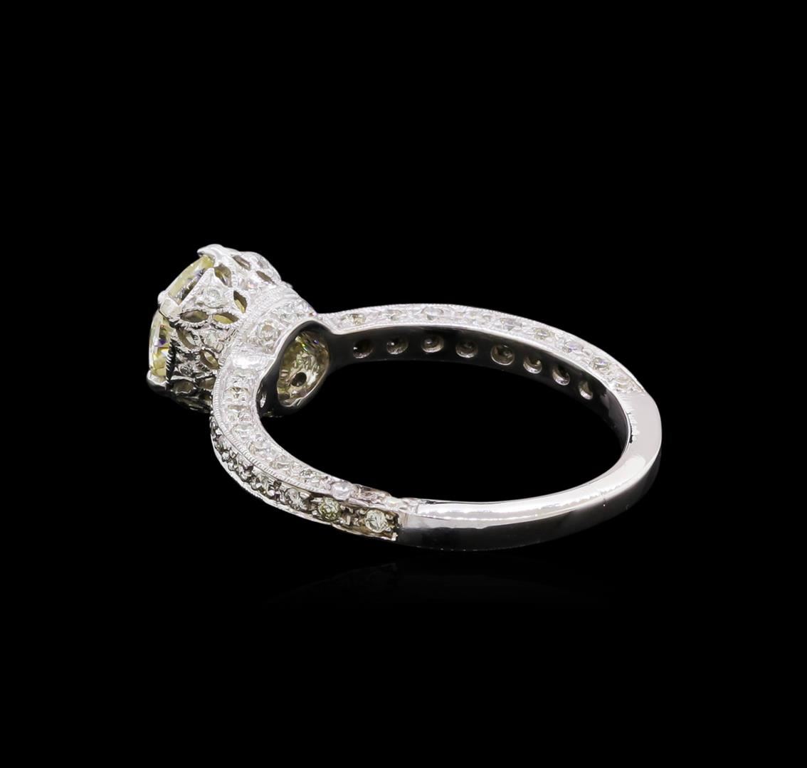 One electronically tested platinum lady's cast wedding ring with a cathedral shank with a bright polish with milgrain detailing finish. The featured lady's ring has a shank measuring 1.96 millimeters wide. Identified with markings of "PT 950". Condition is new, good workmanship. Containing: One prong set round brilliant cut diamond, measuring 7.24 - 7.23 x 4.55mm (depth est.) , 5.00.%. GTCF approximate weight of 1.53ct. Graded in the setting. Clarity: I-1. Color: J. Cut Very Good Seventy-Two prong set round brilliant cut diamonds, measuring 1.25 - 1.15 x 0.74mm (depth est.) approximate total weight of 72 Stones = 0.50ct. Graded in the setting. Clarity: VS-2 to SI-2. Color: F - Good. Total Weight of Diamonds 2.03ct. Total Weight of Ring 4.80gm GAS Appraised at $15,240.00.