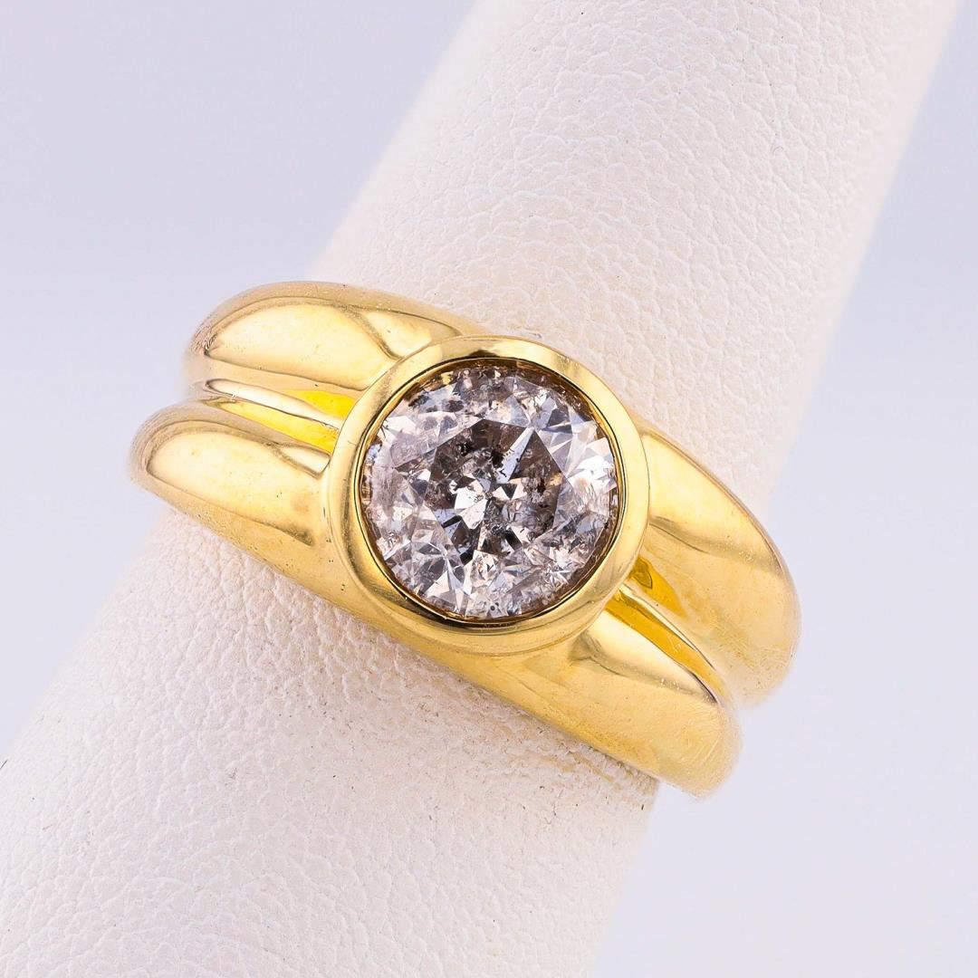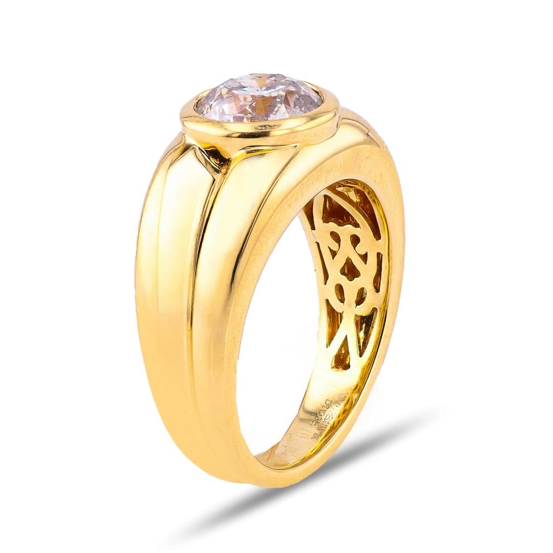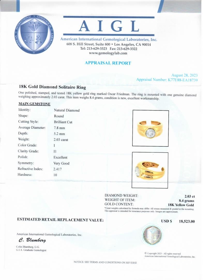 One polished, stamped, and tested 18K yellow gold ring marked Oscar Friedman. The ring is mounted with one genuine diamond weighing approximately 2.03 carat. This item weighs 8.4 grams, condition is new, excellent workmanship. #MAIN GEMSTONE# Identity: Natural Diamond Shape: Round Cutting Style: Brilliant Cut Average Diameter: 7.8mm Depth: 5.2mm Weight: 2.03 carat Color Grade: I Clarity Grade: I1 Polish: Excellent Symmetry: Very Good Refractive Index: 2.417 Hardness: 10 #DIAMOND WEIGHT: 2.03 ct WEIGHT OF ITEM: 8.4 grams GOLD CONTENT: 18K Yellow Gold Size: 6 1/2