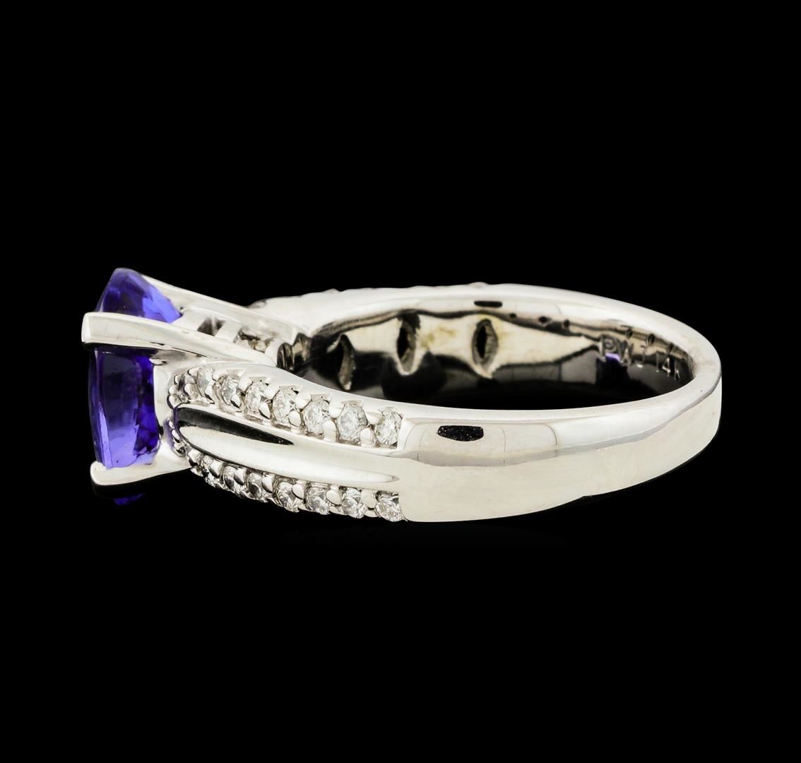 One electronically tested 14KT white gold lady's cast fashion ring with a tapered cathedral shank with a bright polish finish. The featured lady's ring has a shank measuring 2.77 millimeters wide. Identified with markings of '14K'. Condition is new, good workmanship. Containing: One prong set oval modified brilliant cut natural tanzanite, measuring 9.10 x 7.10 x 4.72mm, (depth est.) approximate weight of 2.03ct., clarity is eye clean, medium, moderately strong, bluish violet color, (GIA bV 5/4), cut is very good. Transmitting light with no distortion, transparent. Colored gemstones are presumed to have been subjected to commonly used enhancement processes. Graded in the setting. Thirty-Four prong set round brilliant cut diamonds, measuring 1.40 - 1.35 x 0.86mm (depth est.) approximate total weight of 34 Stones = 0.34ct. Graded in the setting. Clarity VS-2 to SI-1. Color: G - H Cut Good Six prong set round brilliant cut diamonds, measuring 1.25 - 1.20 x 0.76mm (depth est.) approximate total weight of 6 Stones = 0.04ct. Graded in the setting. Clarity VS-2 to SI-1. Color: G - H Cut Good. Total Weight of Colored Stones 2.03ct.. Total Weight of Diamonds 0.38ct.. Total Weight of Ring 5.60gm. GAS Appraised at $4,270.00.