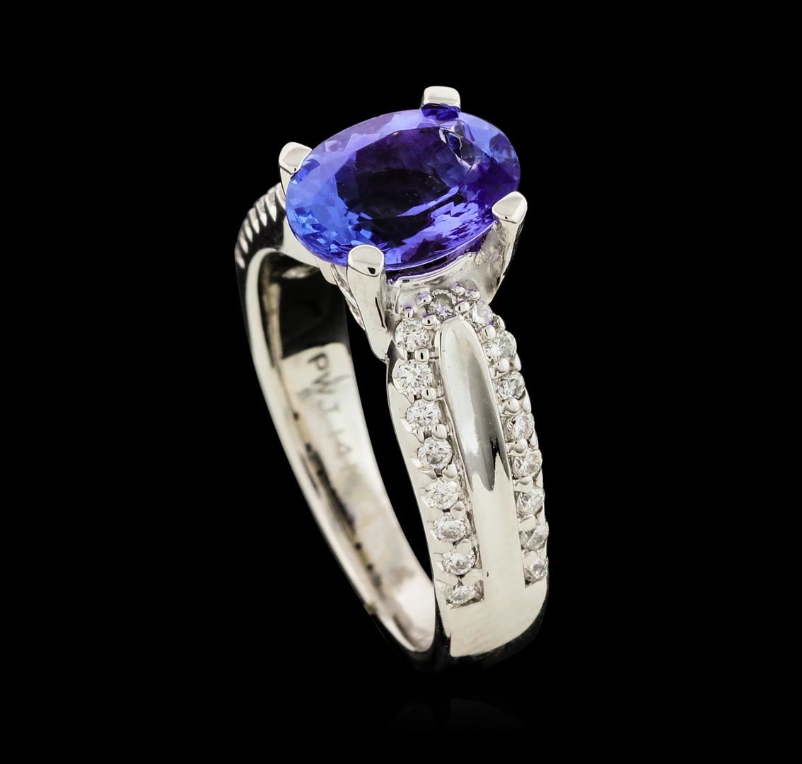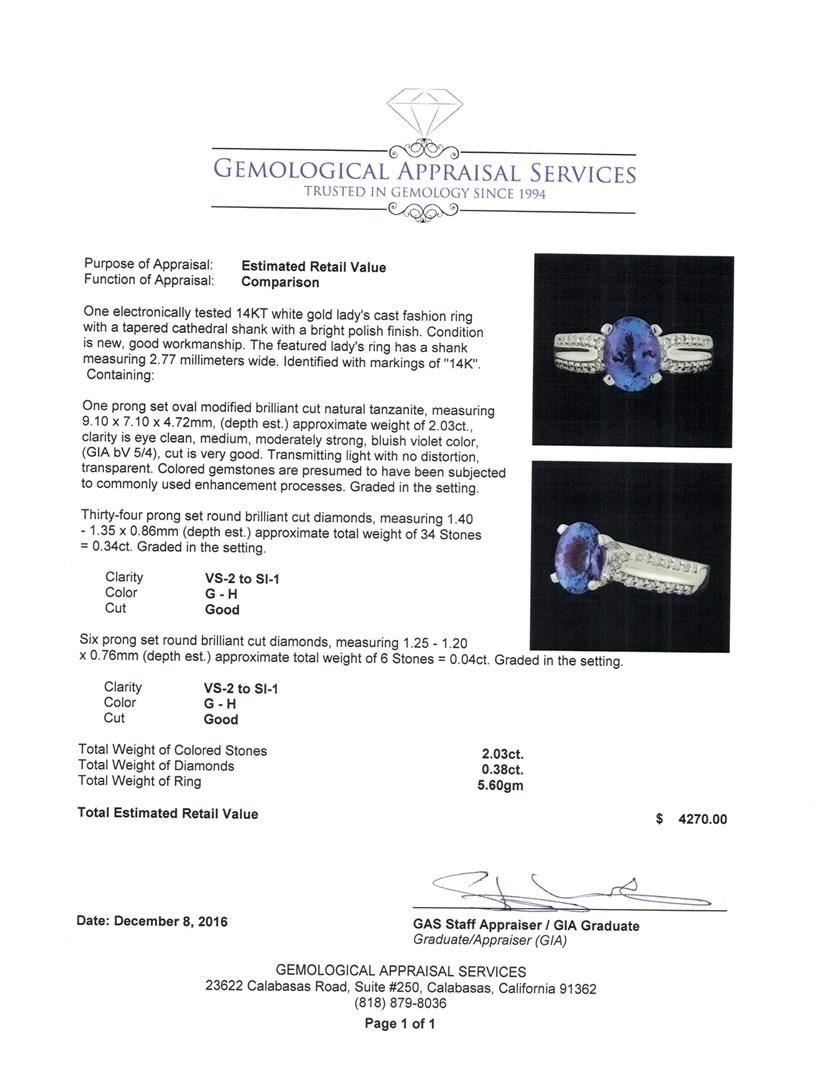 One electronically tested 14KT white gold lady's cast fashion ring with a tapered cathedral shank with a bright polish finish. The featured lady's ring has a shank measuring 2.77 millimeters wide. Identified with markings of '14K'. Condition is new, good workmanship. Containing: One prong set oval modified brilliant cut natural tanzanite, measuring 9.10 x 7.10 x 4.72mm, (depth est.) approximate weight of 2.03ct., clarity is eye clean, medium, moderately strong, bluish violet color, (GIA bV 5/4), cut is very good. Transmitting light with no distortion, transparent. Colored gemstones are presumed to have been subjected to commonly used enhancement processes. Graded in the setting. Thirty-Four prong set round brilliant cut diamonds, measuring 1.40 - 1.35 x 0.86mm (depth est.) approximate total weight of 34 Stones = 0.34ct. Graded in the setting. Clarity VS-2 to SI-1. Color: G - H Cut Good Six prong set round brilliant cut diamonds, measuring 1.25 - 1.20 x 0.76mm (depth est.) approximate total weight of 6 Stones = 0.04ct. Graded in the setting. Clarity VS-2 to SI-1. Color: G - H Cut Good. Total Weight of Colored Stones 2.03ct.. Total Weight of Diamonds 0.38ct.. Total Weight of Ring 5.60gm. GAS Appraised at $4,270.00.