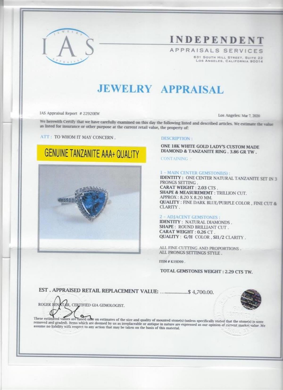 One 2.03ct Tanzanite and Diamond Ring - 18KT White Gold . IAS certified. See Appraisal for more details.