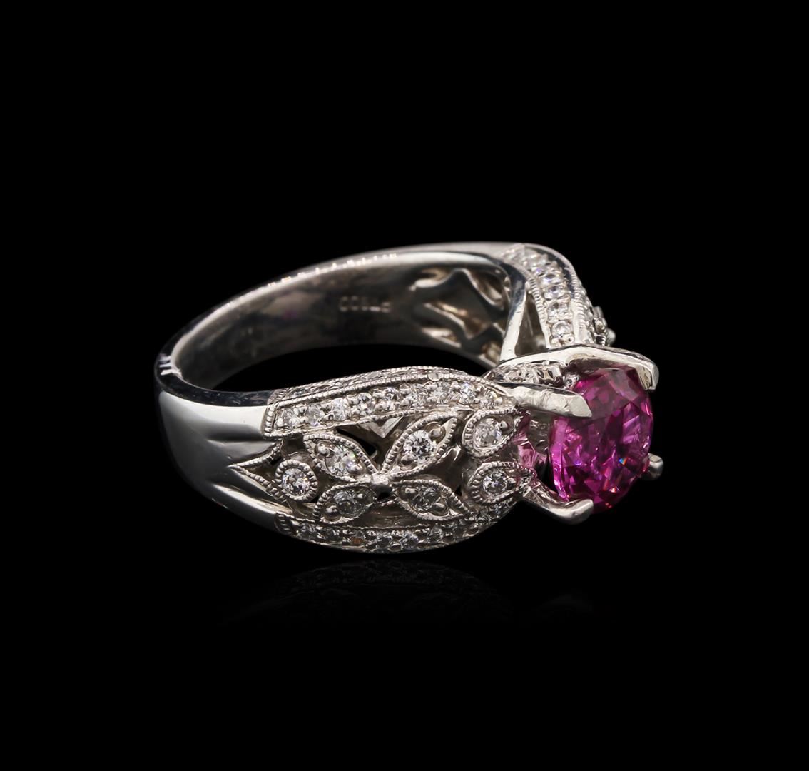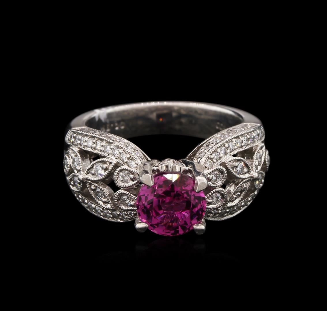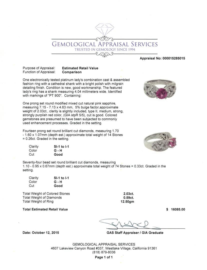 One electronically tested platinum lady's combination cast & assembled fashion ring with a cathedral shank with a bright polish with milgrain detailing finish. The featured lady's ring has a shank measuring 4.04 millimeters wide. Identified with markings of "PT 900". Condition is new, good workmanship. Containing: One prong set round modified mixed cut natural pink sapphire, measuring 7.15 - 7.13 x 4.63 mm, 5% bulge factor, approximate weight of 2.03ct., clarity is slightly included, type II, medium, strong, strongly purplish red color, (GIA stpR 5/5), cut is good. Colored gemstones are presumed to have been subjected to commonly used enhancement processes. Graded in the setting. Fourteen prong set round brilliant cut diamonds, measuring 1.70 - 1.60 x 1.07mm (depth est.) approximate total weight of 14 Stones = 0.26ct. Graded in the setting. Clarity: SI-1 to I-1. Color: G - Good Seventy-Four bead set round brilliant cut diamonds, measuring 1.10 - 0.95 x 0.67mm (depth est.) approximate total weight of 74 Stones = 0.33ct. Graded in the setting. Clarity: SI-1 to I-1. Color: G - Good. Total Weight of Colored Stones 2.03ct. Total Weight of Diamonds 0.59ct. Total Weight of Ring 12.50gm. GAS Appraised at $16,085.00.