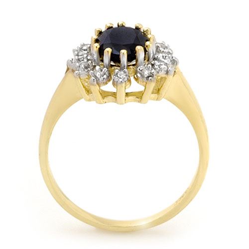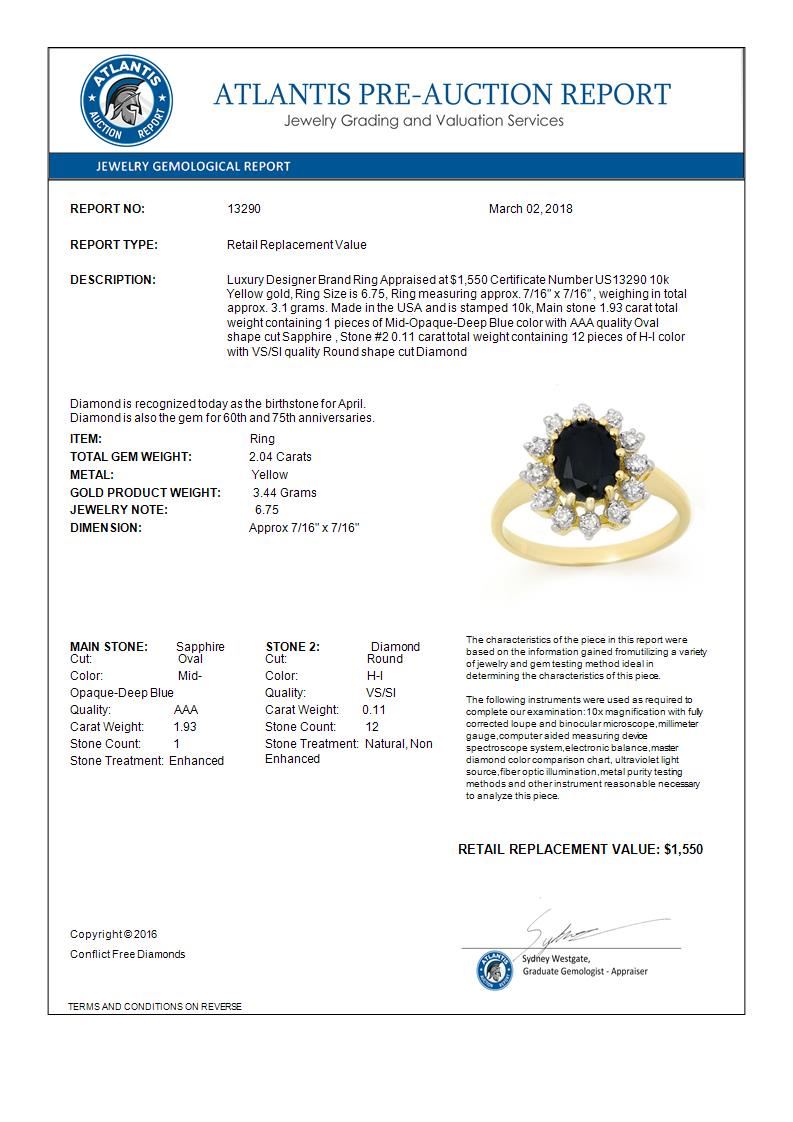 REF-25X5T -13290 ---- 2.04 CTW Blue Sapphire & Diamond Ring 10K Yellow Gold ---- Luxury Designer Brand Ring Appraised at $1,550 Certificate Number US13290 10k Yellow gold, Ring Size is 6.75, Ring measuring approx. 7/16" x 7/16" , weighing in total approx. 3.1 grams. Made in the USA and is stamped 10k, Main stone 1.93 carat total weight containing 1 pieces of Mid-Opaque-Deep Blue color with AAA quality Oval shape cut Sapphire , Stone #2 0.11 carat total weight containing 12 pieces of H-I color with VS/SI quality Round shape cut Diamond