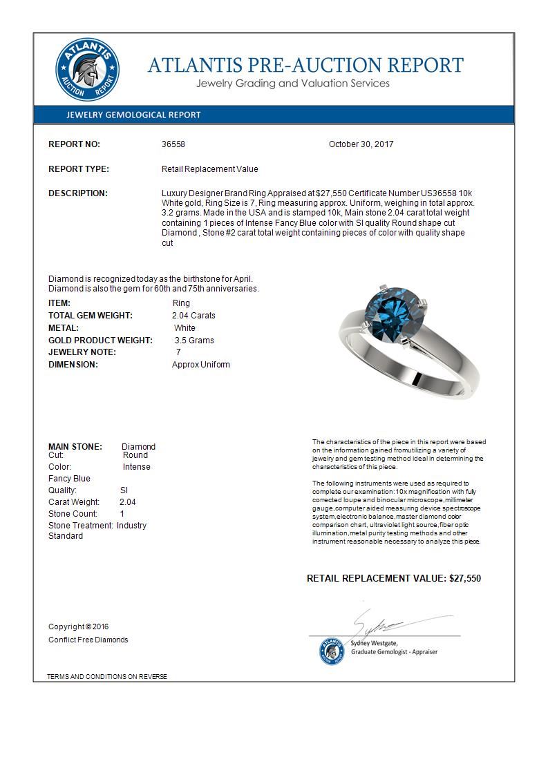 REF-344H5A -36558 ---- 2.04 CTW Certified Intense Blue SI Diamond Solitaire Engagement Ring 10K White Gold ---- Luxury Designer Brand Ring Appraised at $27,550 Certificate Number US36558 10k White gold, Ring Size is 7, Ring measuring approx. Uniform, weighing in total approx. 3.2 grams. Made in the USA and is stamped 10k, Main stone 2.04 carat total weight containing 1 pieces of Intense Fancy Blue color with SI quality Round shape cut Diamond , Stone #2 carat total weight containing pieces of color with quality shape cut