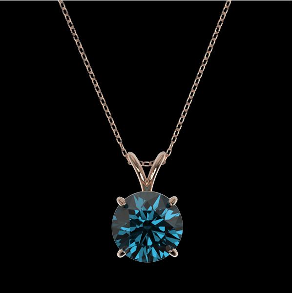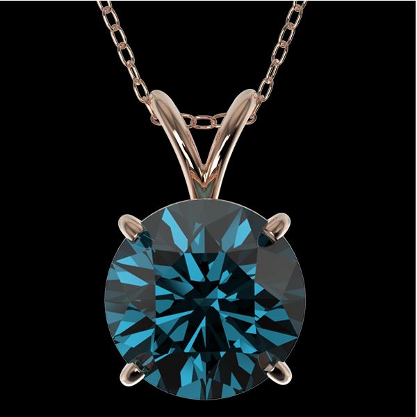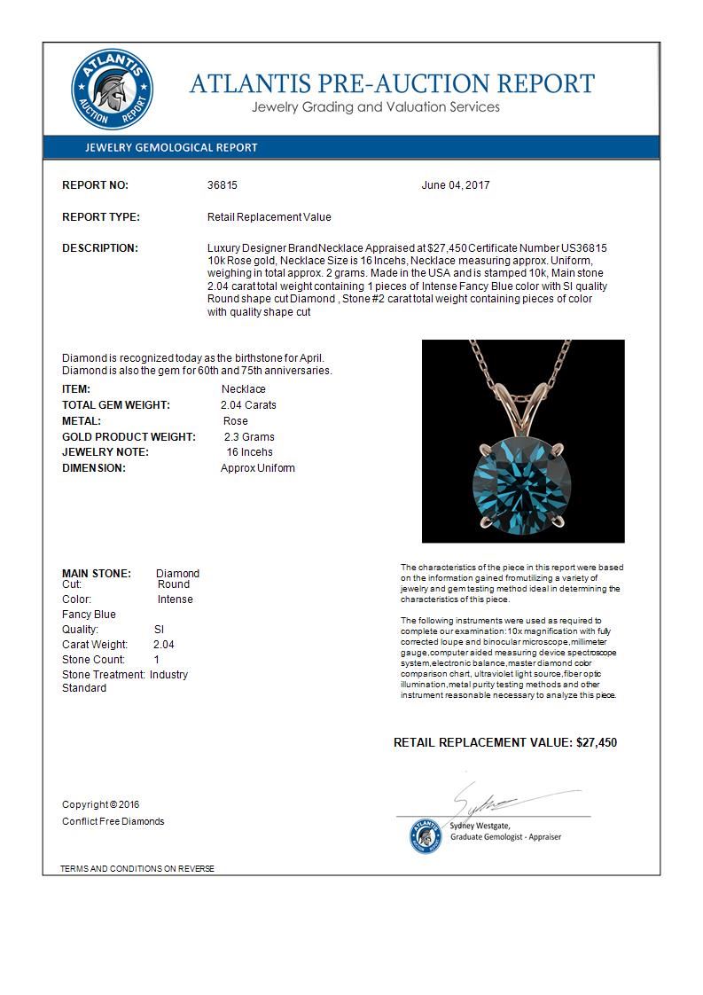 2.04 CTW Certified Intense Blue SI Diamond Solitaire Necklace 10K Rose Gold ---- Luxury Designer Brand Necklace Appraised Retail Price at $27,450 ---- SKU Number US36815 10k Rose gold Necklace Size is 16 Incehs, Necklace measuring approx. Uniform, weighing in total approx. 2 grams. Made in the USA and is stamped 10k, Main stone 2.04 carat total weight containing 1 pieces of Intense Fancy Blue color with SI quality Round shape cut Diamond , Stone #2 carat total weight containing pieces of color with quality shape cut