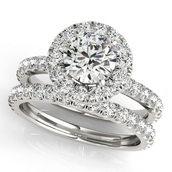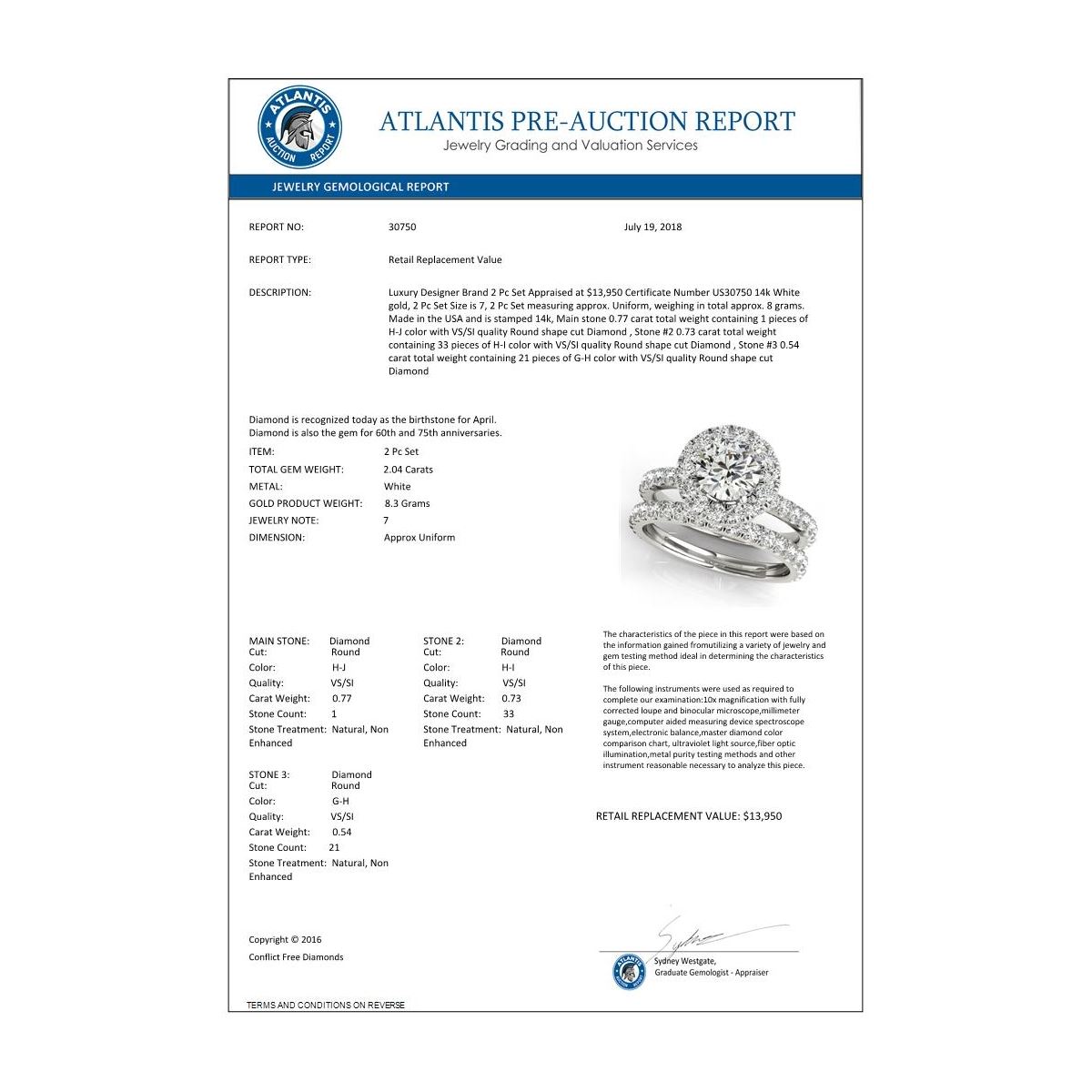 REF-253X6T -30750 ---- 2.04 CTW Certified VS/SI Diamond 2Pc Wedding Set Solitaire Halo 14K White Gold ---- Luxury Designer Brand 2 Pc Set Appraised at $13,950 Certificate Number US30750 14k White gold, 2 Pc Set Size is 7, 2 Pc Set measuring approx. Uniform, weighing in total approx. 8 grams. Made in the USA and is stamped 14k, Main stone 0.77 carat total weight containing 1 pieces of H-J color with VS/SI quality Round shape cut Diamond , Stone #2 0.73 carat total weight containing 33 pieces of H-I color with VS/SI quality Round shape cut Diamond , Stone #3 0.54 carat total weight containing 21 pieces of G-H color with VS/SI quality Round shape cut Diamond