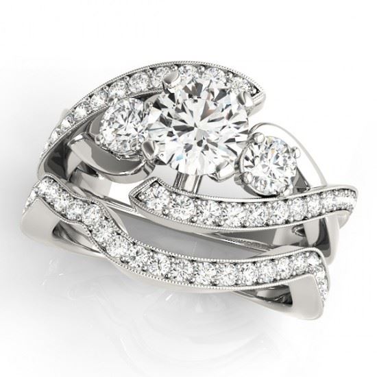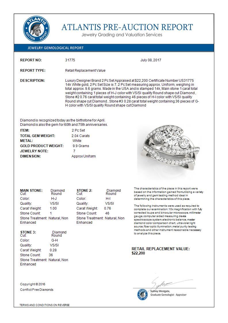 2.04 CTW Certified VS/SI Diamond Bypass Solitaire 2Pc Wedding Set 14K White Gold ---- Luxury Designer Brand 2 Pc Set Appraised Retail Price at $22,200 ---- SKU Number US31775 14k White gold 2 Pc Set Size is 7, 2 Pc Set measuring approx. Uniform, weighing in total approx. 9.6 grams. Made in the USA and is stamped 14k, Main stone 1.00 carat total weight containing 1 pieces of H-J color with VS/SI quality Round shape cut Diamond , Stone #2 0.76 carat total weight containing 46 pieces of H-I color with VS/SI quality Round shape cut