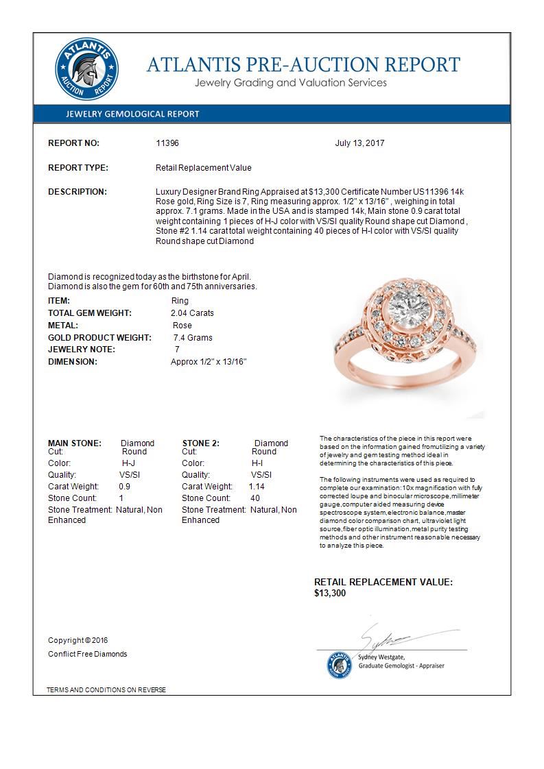 2.04 CTW Certified VS/SI Diamond Ring 14K Rose Gold ---- Luxury Designer Brand Ring Appraised Retail Price at $13,300 ---- SKU Number US11396 14k Rose gold Ring Size is 7, Ring measuring approx. 1/2" x 13/16" , weighing in total approx. 7.1 grams. Made in the USA and is stamped 14k, Main stone 0.9 carat total weight containing 1 pieces of H-J color with VS/SI quality Round shape cut Diamond , Stone #2 1.14 carat total weight containing 40 pieces of H-I color with VS/SI quality Round shape cut