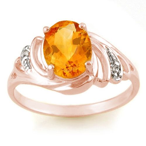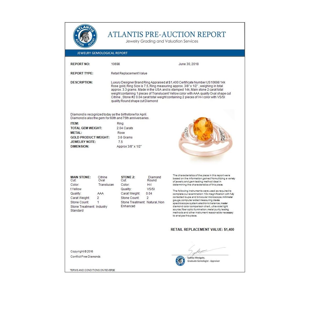 REF-22N8Y -10698 ---- 2.04 CTW Citrine & Diamond Ring 14K Rose Gold ---- Luxury Designer Brand Ring Appraised at $1,400 Certificate Number US10698 14k Rose gold, Ring Size is 7.5, Ring measuring approx. 3/8" x 1/2" , weighing in total approx. 3.3 grams. Made in the USA and is stamped 14k, Main stone 2 carat total weight containing 1 pieces of Translucent Yellow color with AAA quality Oval shape cut Citrine , Stone #2 0.04 carat total weight containing 2 pieces of H-I color with VS/SI quality Round shape cut Diamond