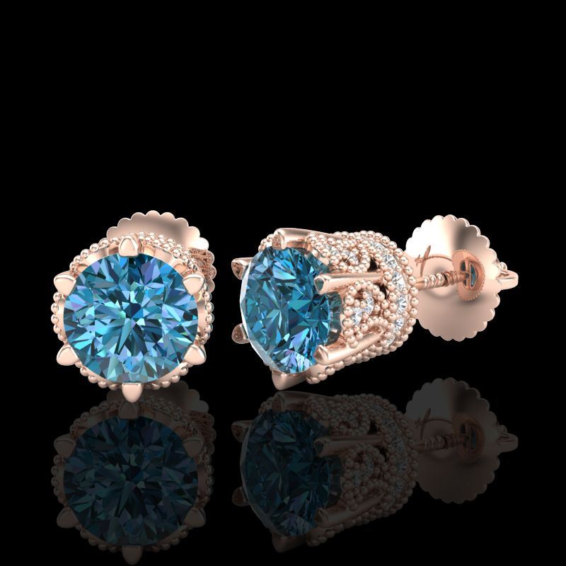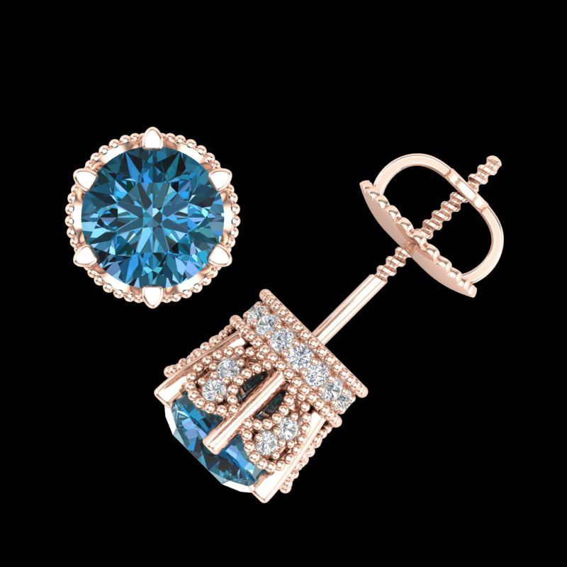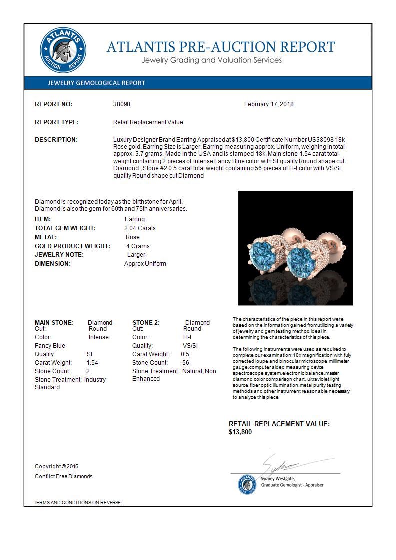 REF-209F3N -38098 ---- 2.04 CTW Fancy Intense Blue Diamond Art Deco Stud Earrings 18K Rose Gold ---- Luxury Designer Brand Earring Appraised at $13,800 Certificate Number US38098 18k Rose gold, Earring Size is Larger, Earring measuring approx. Uniform, weighing in total approx. 3.7 grams. Made in the USA and is stamped 18k, Main stone 1.54 carat total weight containing 2 pieces of Intense Fancy Blue color with SI quality Round shape cut Diamond , Stone #2 0.5 carat total weight containing 56 pieces of H-I color with VS/SI quality Round shape cut Diamond