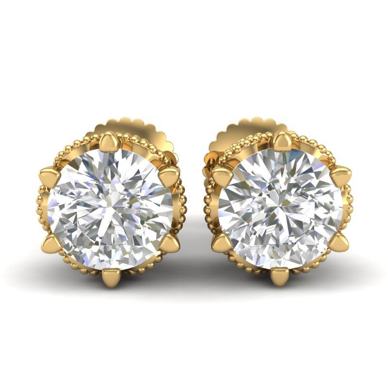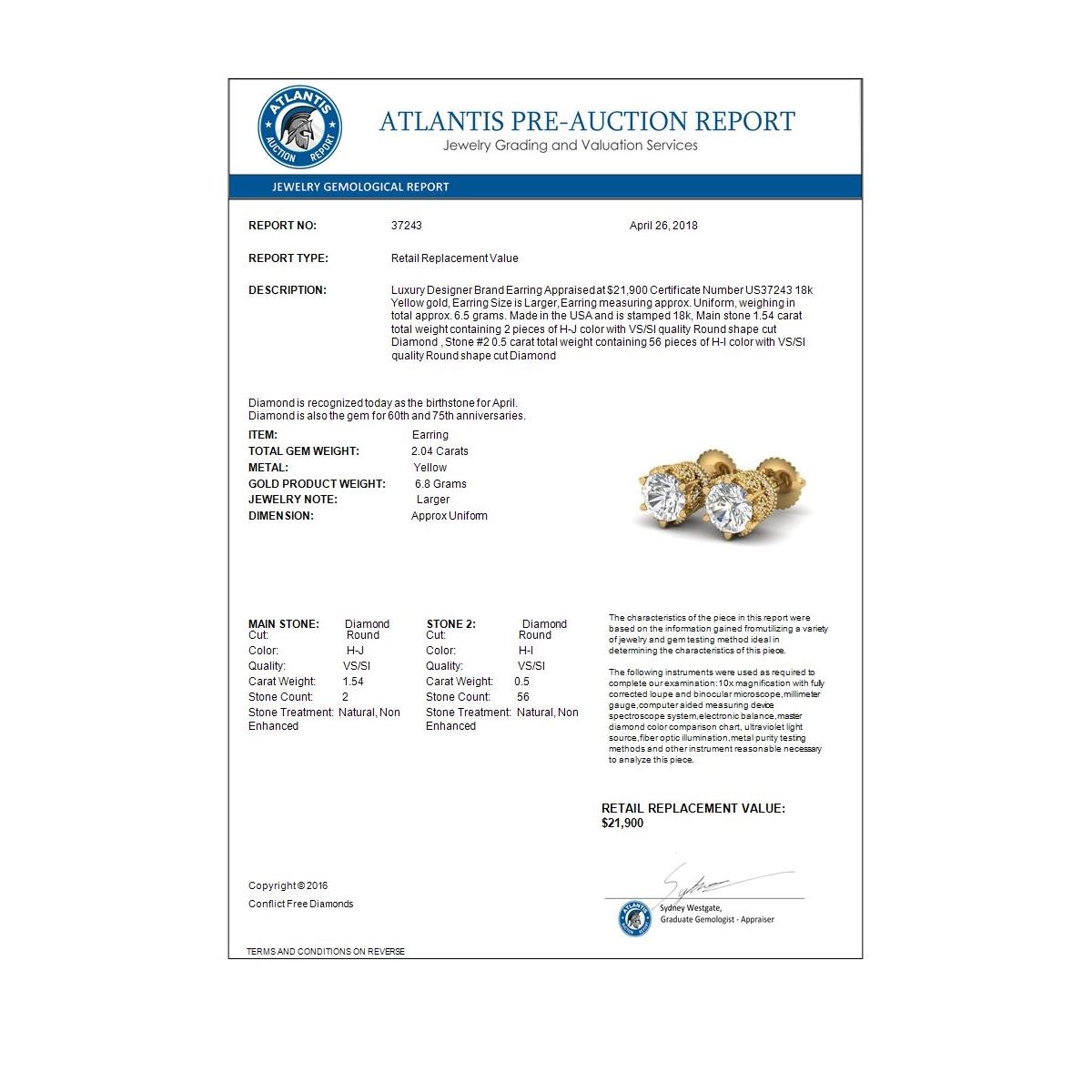REF-361X8T -37243 ---- 2.04 CTW VS/SI Diamond Solitaire Art Deco Stud Earrings 18K Yellow Gold ---- Luxury Designer Brand Earring Appraised at $21,900 Certificate Number US37243 18k Yellow gold, Earring Size is Larger, Earring measuring approx. Uniform, weighing in total approx. 6.5 grams. Made in the USA and is stamped 18k, Main stone 1.54 carat total weight containing 2 pieces of H-J color with VS/SI quality Round shape cut Diamond , Stone #2 0.5 carat total weight containing 56 pieces of H-I color with VS/SI quality Round shape cut Diamond