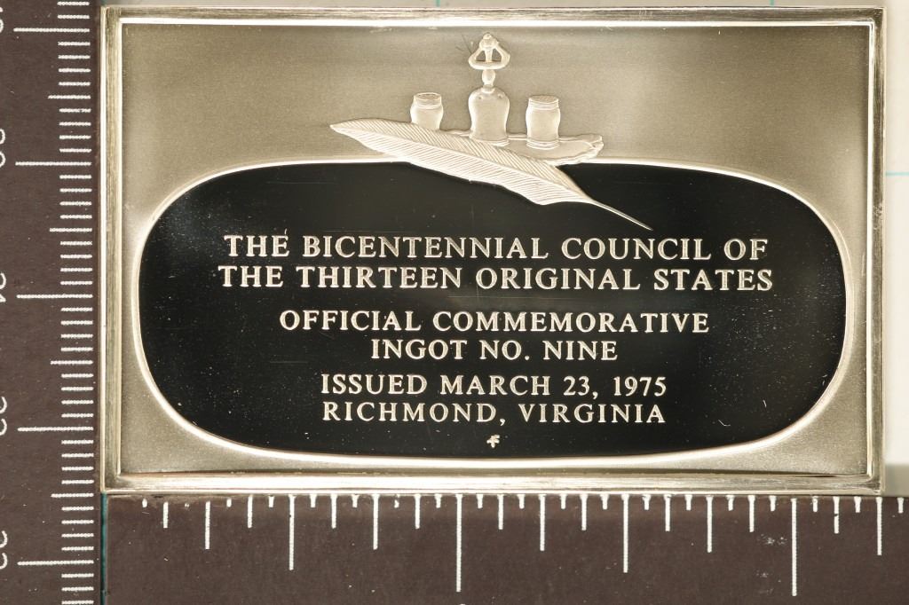 COUCIL OF THE 13 ORIGINAL STATES, INGOT #9 ISSUED MARCH 23RD, 1975, RICHMOND VIRGINIA, EDGE MARKED