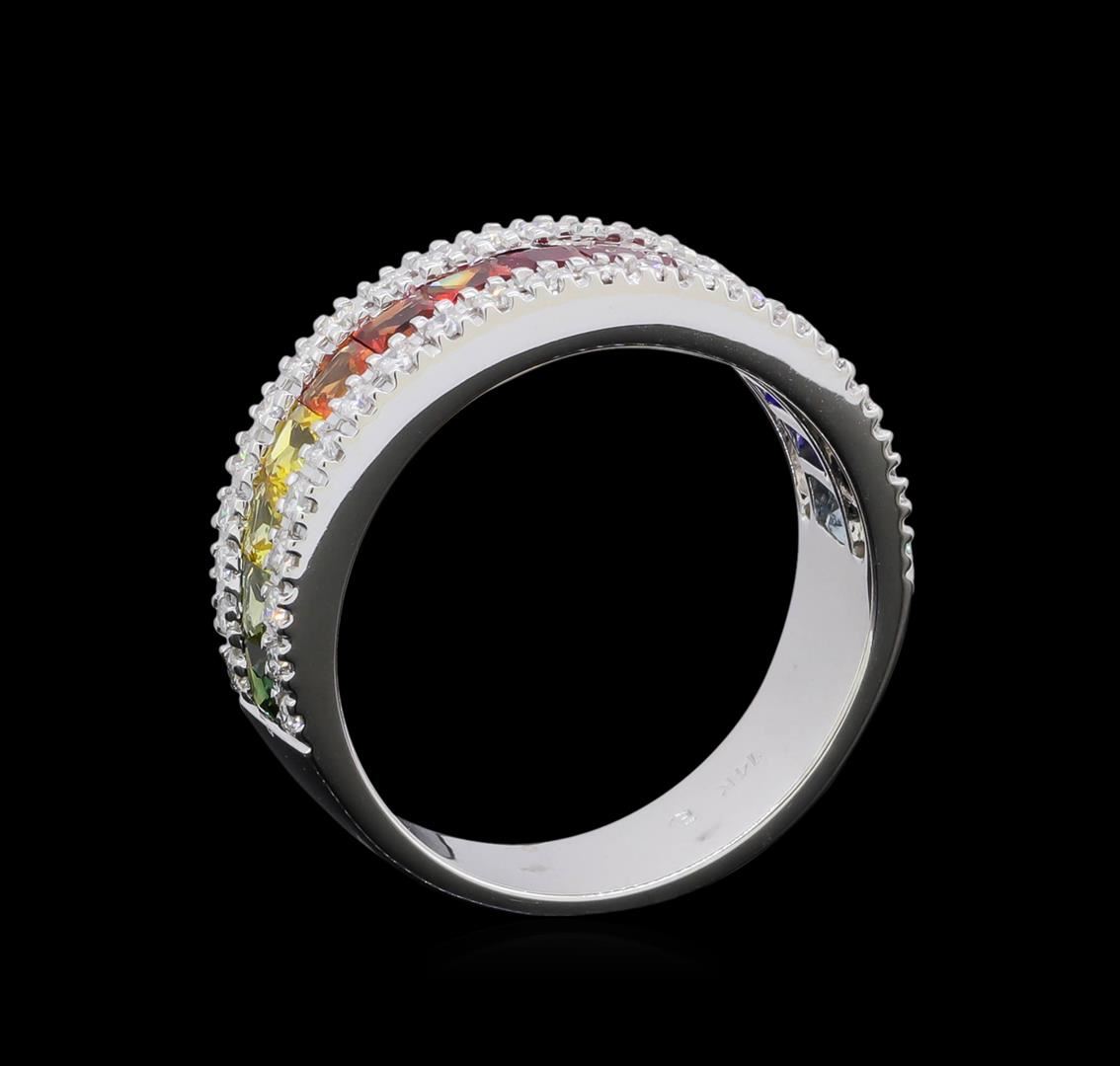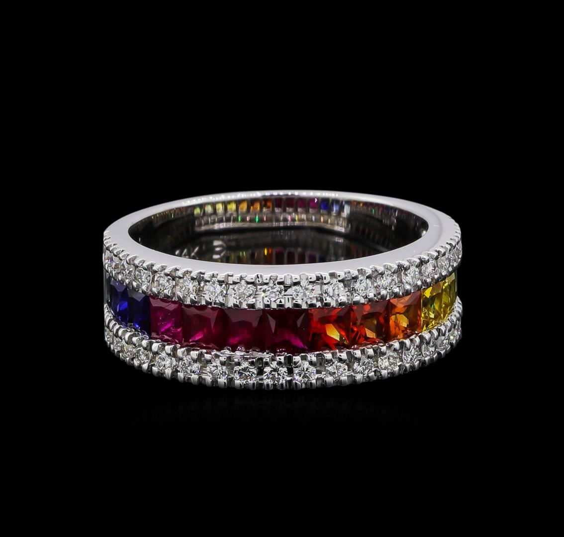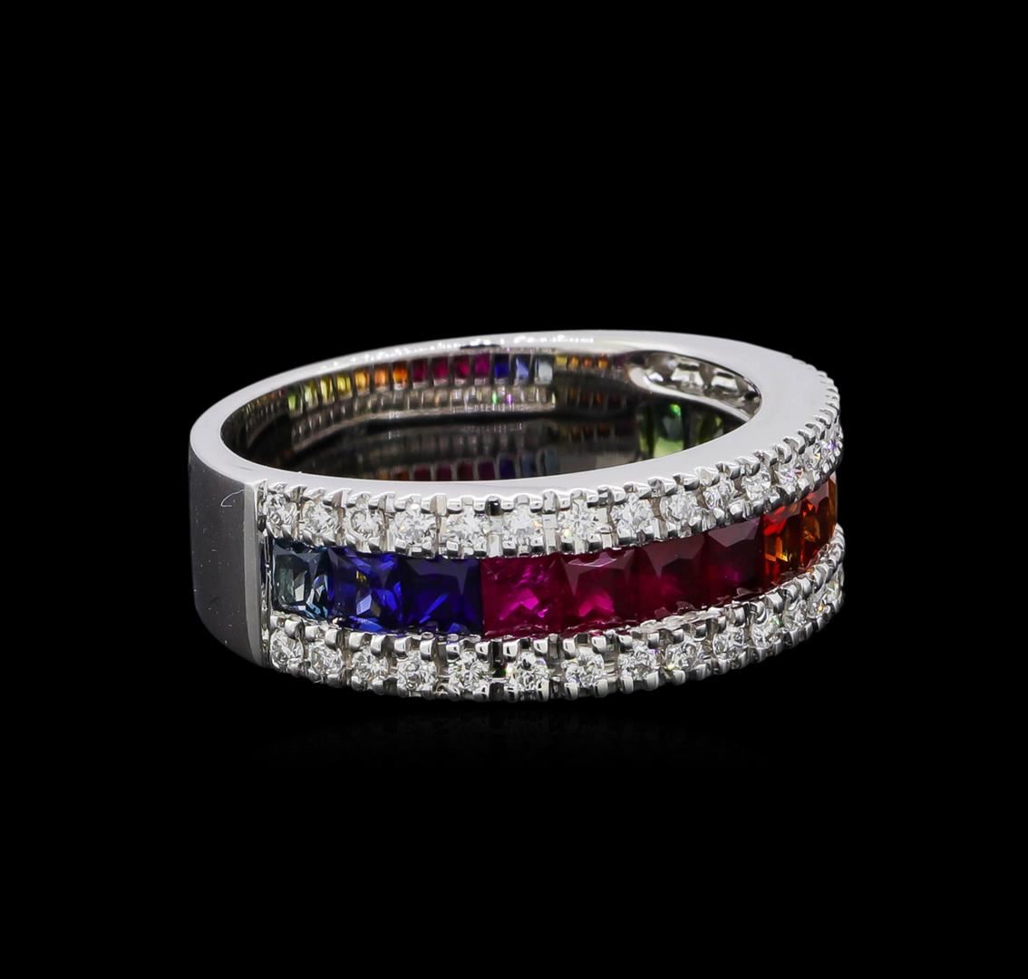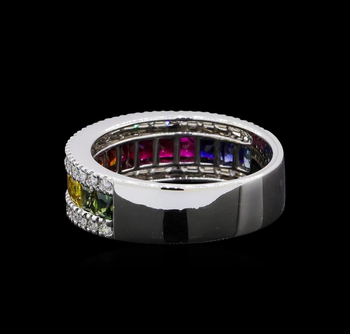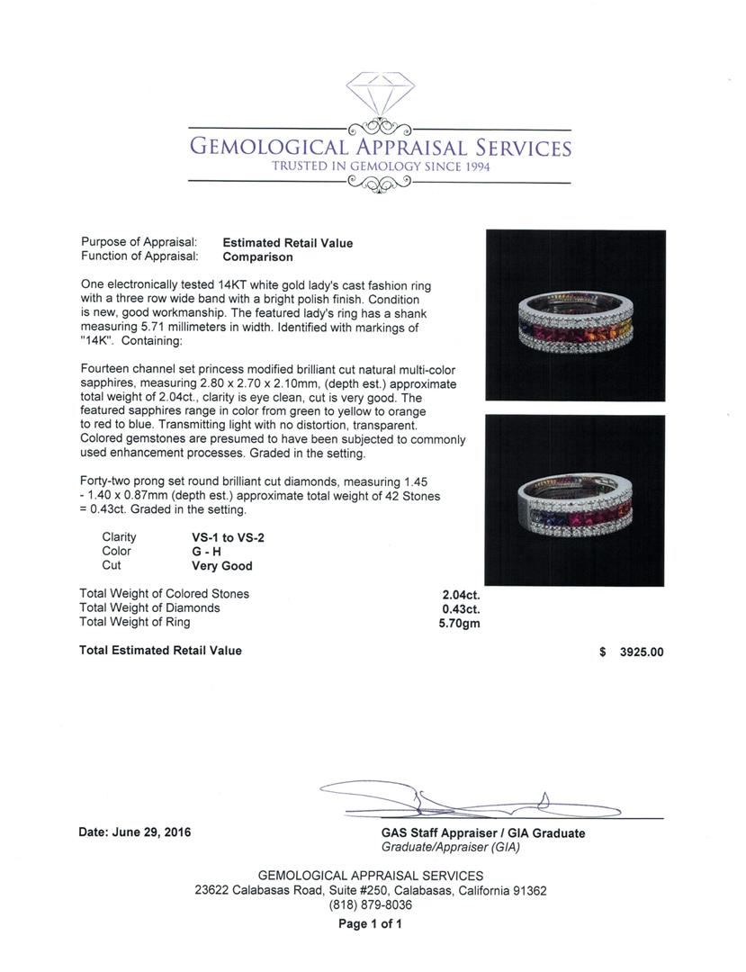 One electronically tested 14KT white gold lady's cast fashion ring with a three row wide band with a bright polish finish. The featured lady's ring has a shank measuring 5.71 millimeters in width. Identified with markings of "14K". Condition is new, good workmanship. Containing: Fourteen channel set princess modified brilliant cut natural multi-color sapphires, measuring 2.80 x 2.70 x 2.10mm, (depth est.) approximate total weight of 2.04ct., clarity is eye clean, cut is very good. The featured sapphires range in color from green to yellow to orange to red to blue. Transmitting light with no distortion, transparent. Colored gemstones are presumed to have been subjected to commonly used enhancement processes. Graded in the setting. Forty-Two prong set round brilliant cut diamonds, measuring 1.45 - 1.40 x 0.87mm (depth est.) approximate total weight of 42 Stones = 0.43ct. Graded in the setting. Clarity: VS-1 to VS-2. Color: G - H. Cut Very Good. Total Weight of Colored Stones 2.04ct. Total Weight of Diamonds 0.43ct. Total Weight of Ring 5.70gm. GAS Appraised at $3,925.00.