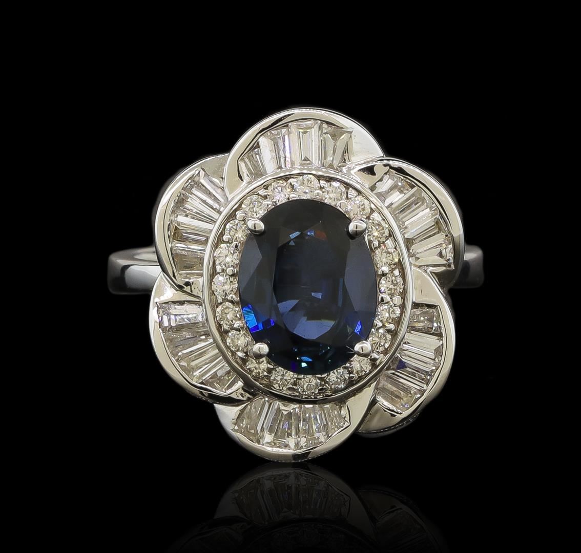 One electronically tested 14KT white gold lady's cast fashion ring with a scalloped halo with a bright polish finish. The featured lady's ring has a shank measuring 2.52 millimeters wide. Identified with markings of '14K'. Condition is new, good workmanship. Containing: One prong set oval modified brilliant cut natural blue sapphire, measuring 9.11 x 7.16 x 3.72mm, (depth est.) approximate weight of 2.04ct., clarity is eye clean, medium, moderately strong, very slightly greenish blue color, (GIA vslgB 5/4), cut is good. Transmitting light with no distortion, transparent. Colored gemstones are presumed to have been subjected to commonly used enhancement processes. Graded in the setting. Twenty-Four channel set baguette cut diamonds, measuring from 1.60 x 1.40 x 1.19mm (depth est.) to 2.60 x 2.10 x 1.79mm (depth est.) approximate total weight of 24 Stones = 1.21ct. Graded in the setting. Clarity VS-2 to SI-1. Color: G - H Cut Good Twenty prong set round brilliant cut diamonds, measuring 1.30 - 1.20 x 0.78mm (depth est.) approximate total weight of 20 Stones = 0.15ct. Graded in the setting. Clarity SI-1 to SI-2. Color: G - H Cut Good. Total Weight of Colored Stones 2.04ct.. Total Weight of Diamonds 1.36ct.. Total Weight of Ring 6.10gm. GAS Appraised at $10,395.00.