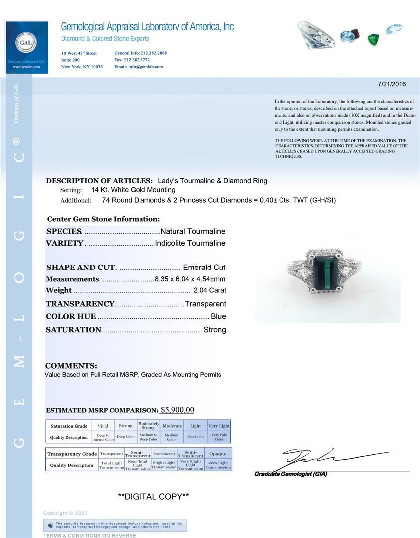 One Lady's tourmaline and diamond ring. Setting: 14kt white gold mounting. Additional: 74 round diamonds and 2 princess cut diamonds = 0.40cts TWT (G-H/SI). Center gem stone information: Species: natural tourmaline. Variety: indicolite tourmaline. Shape and cut: emerald cut. Measurements: 8.35 x 6.04 x 4.54mm. Weight: 2.04 carats. Transparency: transparent. Color hue: blue. Saturation: strong. Total Weight: 3.95 grams.