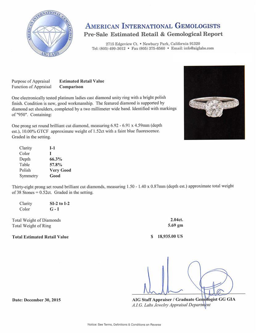 One electronically tested platinum ladies cast diamond unity ring with a bright polish finish. The featured diamond is supported by diamond set shoulders, completed by a two millimeter wide band. Identified with markings of "950". Condition is new, good workmanship. Containing: One prong set round brilliant cut diamond, measuring 6.92 - 6.91 x 4.59mm (depth est.), 10.00.%. GTCF approximate weight of 1.52ct with a faint blue fluorescence. Graded in the setting. Clarity: I-1. Color: I. Depth 66.3%. Table 57.8%. Thirty-Eight prong set round brilliant cut diamonds, measuring 1.50 - 1.40 x 0.87mm (depth est.) approximate total weight of 38 Stones = 0.52ct. Graded in the setting. Clarity: SI-2 to I-2. Color: G - I. Total Weight of Diamonds 2.04ct. Total Weight of Ring 5.69gm. AIG Appraised at $18,935.00.