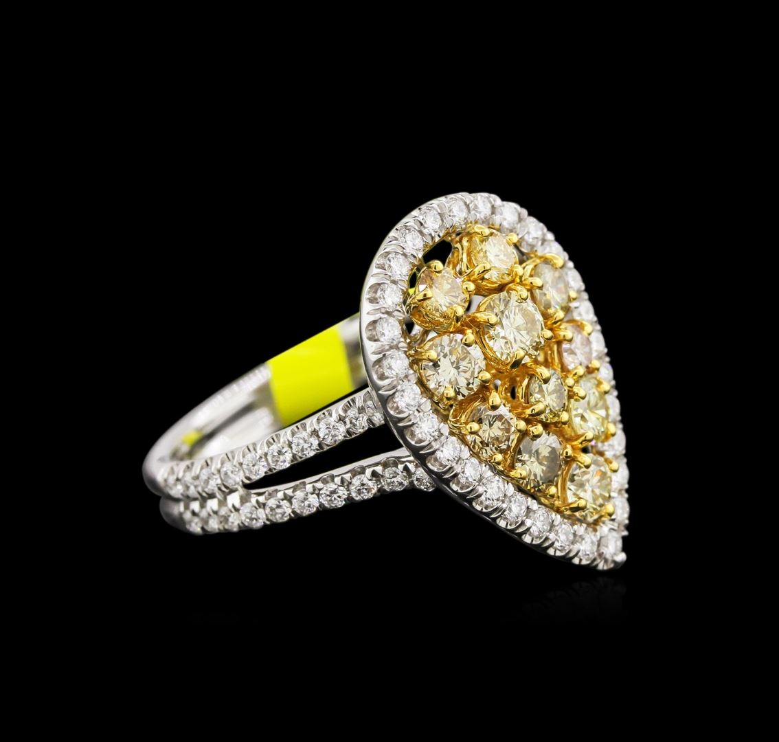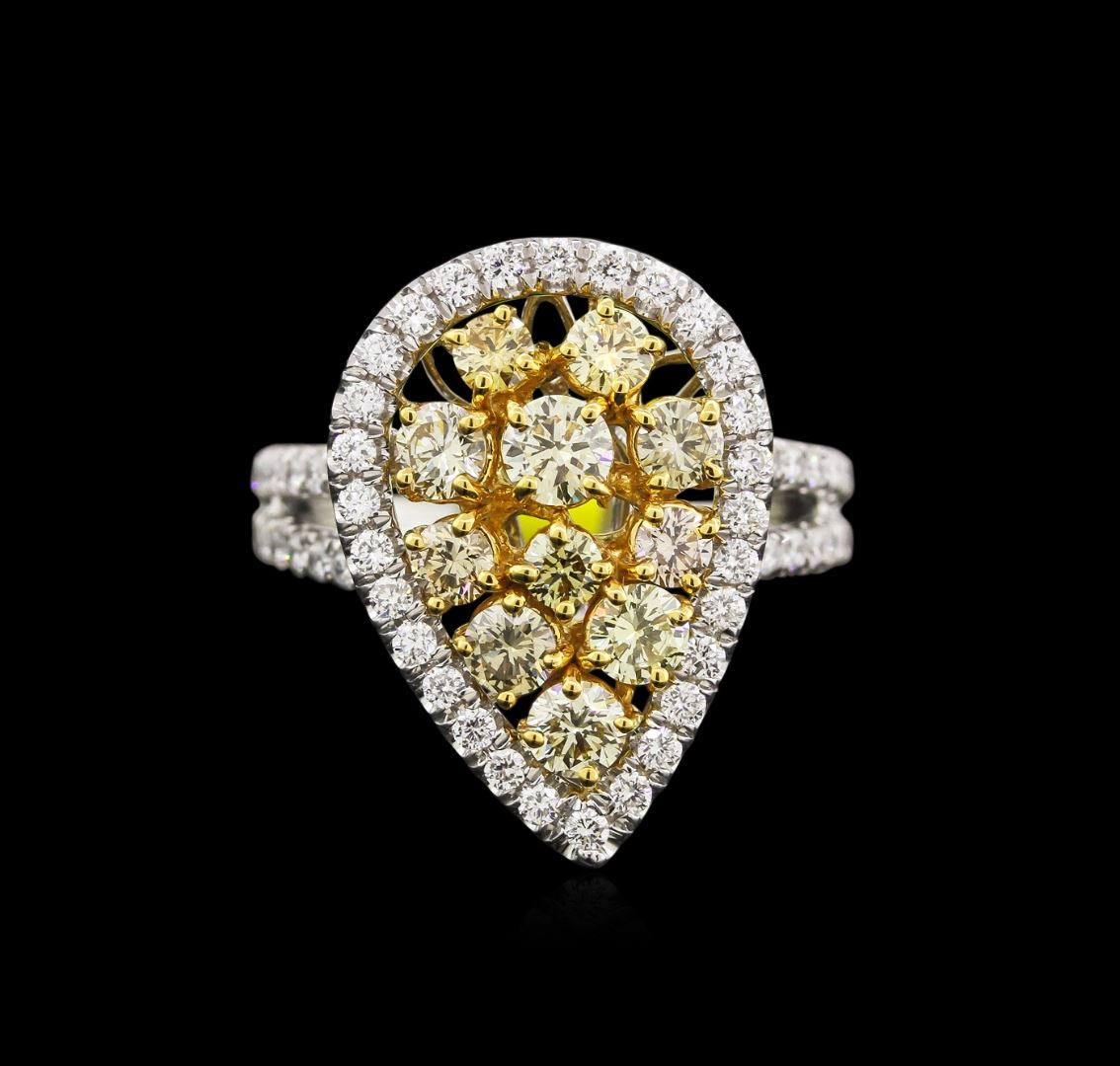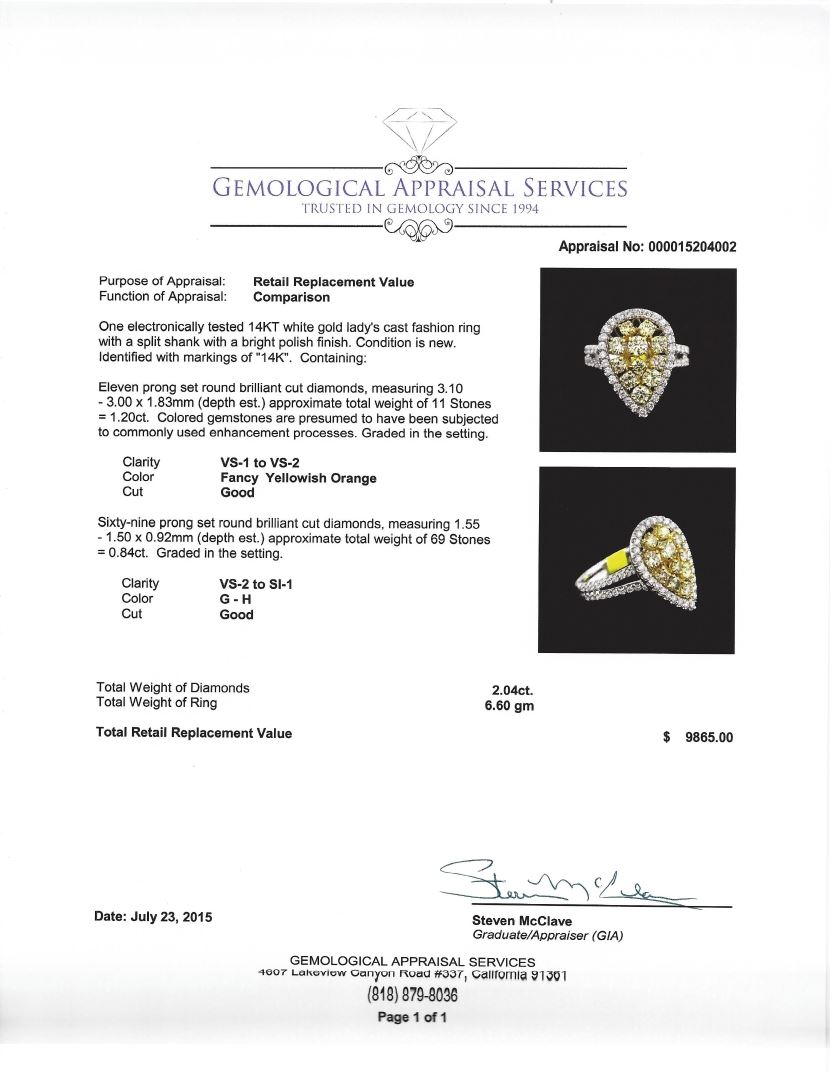 One electronically tested 14KT white gold lady's cast fashion ring with a split shank with a bright polish finish. Condition is new. Identified with markings of "14K". Containing: Eleven prong set round brilliant cut diamonds, measuring 3.10 - 3.00 x 1.83mm (depth est.) approximate total weight of 11 Stones = 1.20ct. Colored gemstones are presumed to have been subjected to commonly used enhancement processes. Graded in the setting. Clarity: VS-1 to VS-2. Color: Fancy Yellowish Orange. Cut: Good. Sixty-nine prong set round brilliant cut diamonds, measuring 1.55 - 1.50 x 0.92mm (depth est.) approximate total weight of 69 Stones = 0.84ct. Graded in the setting. Clarity: VS-2 to SI-1. Color: G - H. Cut: Good. Total Weight of Diamonds: 2.04ct. Total Weight of Ring: 6.60 gm. GAS Appraised at $9,865.00.