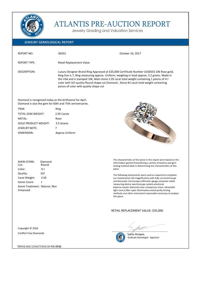36553 - REF-477X3R ---- 2.05 CTW Certified H-SI/I Quality Diamond Solitaire Engagement Ring 10K Rose Gold ---- Luxury Designer Brand Ring Appraised at $35,000 Certificate Number US36553 10k Rose gold, Ring Size is 7, Ring measuring approx. Uniform, weighing in total approx. 3.2 grams. Made in the USA and is stamped 10k, Main stone 2.05 carat total weight containing 1 pieces of H-I color with SI/I quality Round shape cut Diamond , Stone #2 carat total weight containing pieces of color with quality shape cut