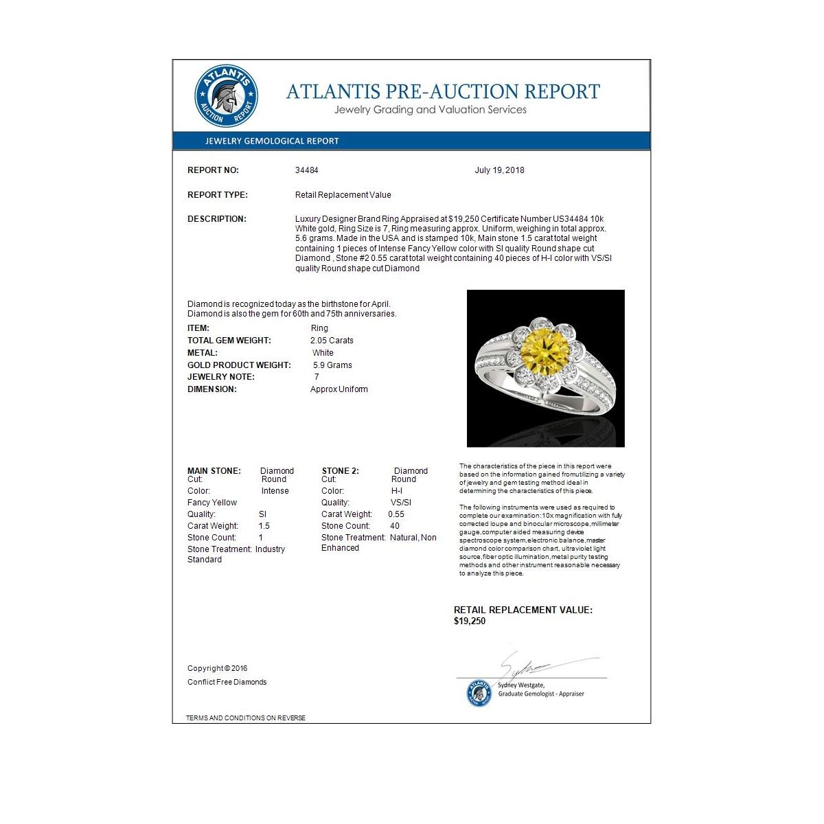 REF-318H2A -34484 ---- 2.05 CTW Certified Si/I Fancy Intense Yellow Diamond Solitaire Halo Ring 10K White Gold ---- Luxury Designer Brand Ring Appraised at $19,250 Certificate Number US34484 10k White gold, Ring Size is 7, Ring measuring approx. Uniform, weighing in total approx. 5.6 grams. Made in the USA and is stamped 10k, Main stone 1.5 carat total weight containing 1 pieces of Intense Fancy Yellow color with SI quality Round shape cut Diamond , Stone #2 0.55 carat total weight containing 40 pieces of H-I color with VS/SI quality Round shape cut Diamond