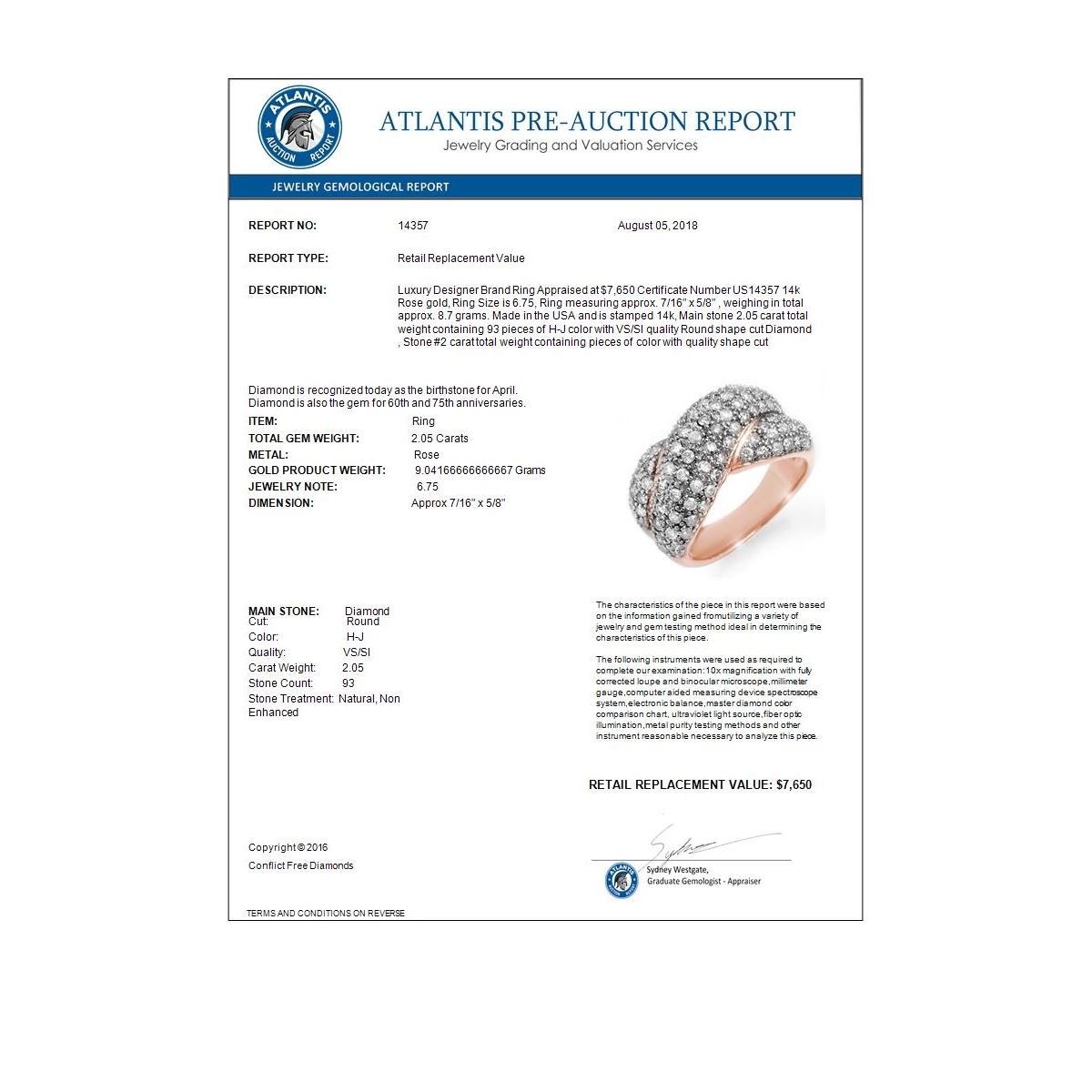 REF-154W4F -14357 ---- 2.05 CTW Certified VS/SI Diamond Ring 14K Rose Gold ---- Luxury Designer Brand Ring Appraised at $7,650 Certificate Number US14357 14k Rose gold, Ring Size is 6.75, Ring measuring approx. 7/16" x 5/8" , weighing in total approx. 8.7 grams. Made in the USA and is stamped 14k, Main stone 2.05 carat total weight containing 93 pieces of H-J color with VS/SI quality Round shape cut Diamond , Stone #2 carat total weight containing pieces of color with quality shape cut