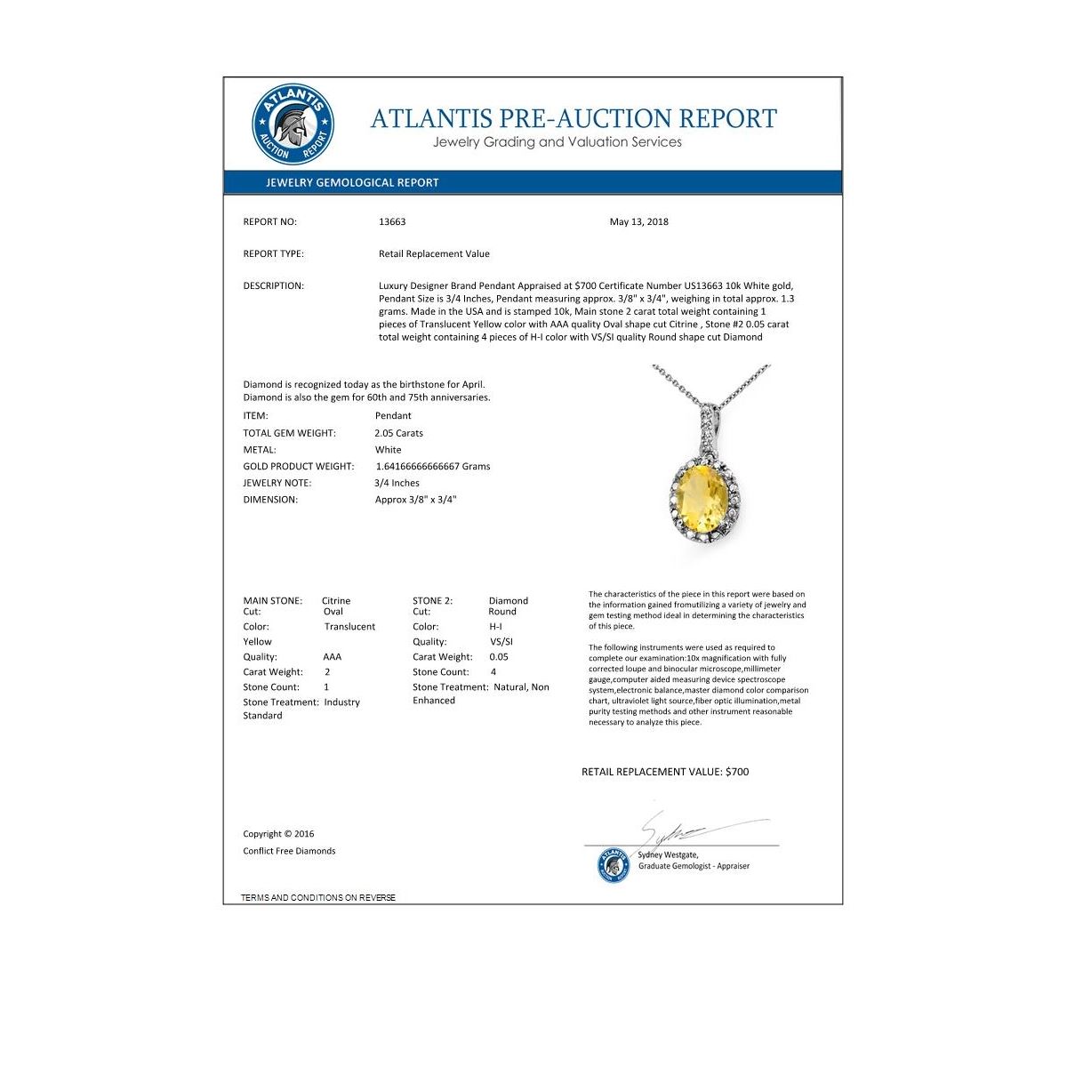 REF-11X8T -13663 ---- 2.05 CTW Citrine & Diamond Pendant 10K White Gold ---- Luxury Designer Brand Pendant Appraised at $700 Certificate Number US13663 10k White gold, Pendant Size is 3/4 Inches, Pendant measuring approx. 3/8" x 3/4", weighing in total approx. 1.3 grams. Made in the USA and is stamped 10k, Main stone 2 carat total weight containing 1 pieces of Translucent Yellow color with AAA quality Oval shape cut Citrine , Stone #2 0.05 carat total weight containing 4 pieces of H-I color with VS/SI quality Round shape cut Diamond