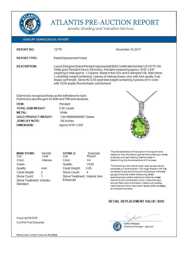 REF-13X5T -13775 ---- 2.05 CTW Peridot & Diamond Pendant 10K White Gold ---- Luxury Designer Brand Pendant Appraised at $950 Certificate Number US13775 10k White gold, Pendant Size is 5/8 Inches, Pendant measuring approx. 9/16" x 5/8", weighing in total approx. 1.3 grams. Made in the USA and is stamped 10k, Main stone 2 carat total weight containing 1 pieces of Intense Green color with AAA quality Oval shape cut Peridot , Stone #2 0.05 carat total weight containing 4 pieces of H-I color with VS/SI quality Round shape cut Diamond