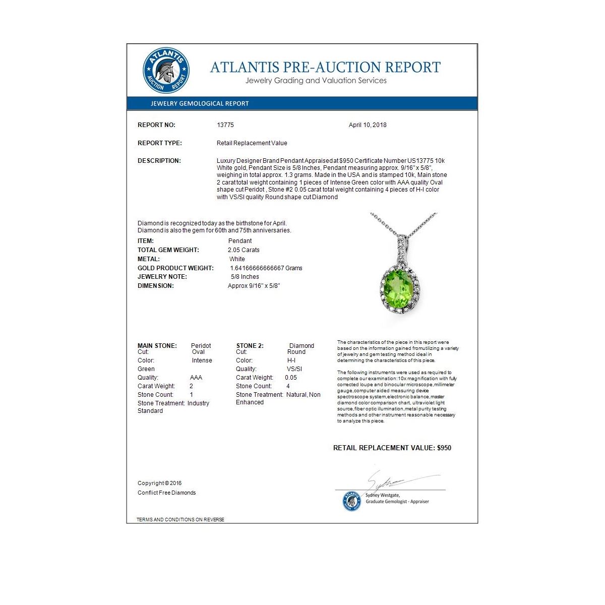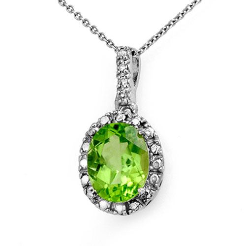 REF-13X5T -13775 ---- 2.05 CTW Peridot & Diamond Pendant 10K White Gold ---- Luxury Designer Brand Pendant Appraised at $950 Certificate Number US13775 10k White gold, Pendant Size is 5/8 Inches, Pendant measuring approx. 9/16" x 5/8", weighing in total approx. 1.3 grams. Made in the USA and is stamped 10k, Main stone 2 carat total weight containing 1 pieces of Intense Green color with AAA quality Oval shape cut Peridot , Stone #2 0.05 carat total weight containing 4 pieces of H-I color with VS/SI quality Round shape cut Diamond