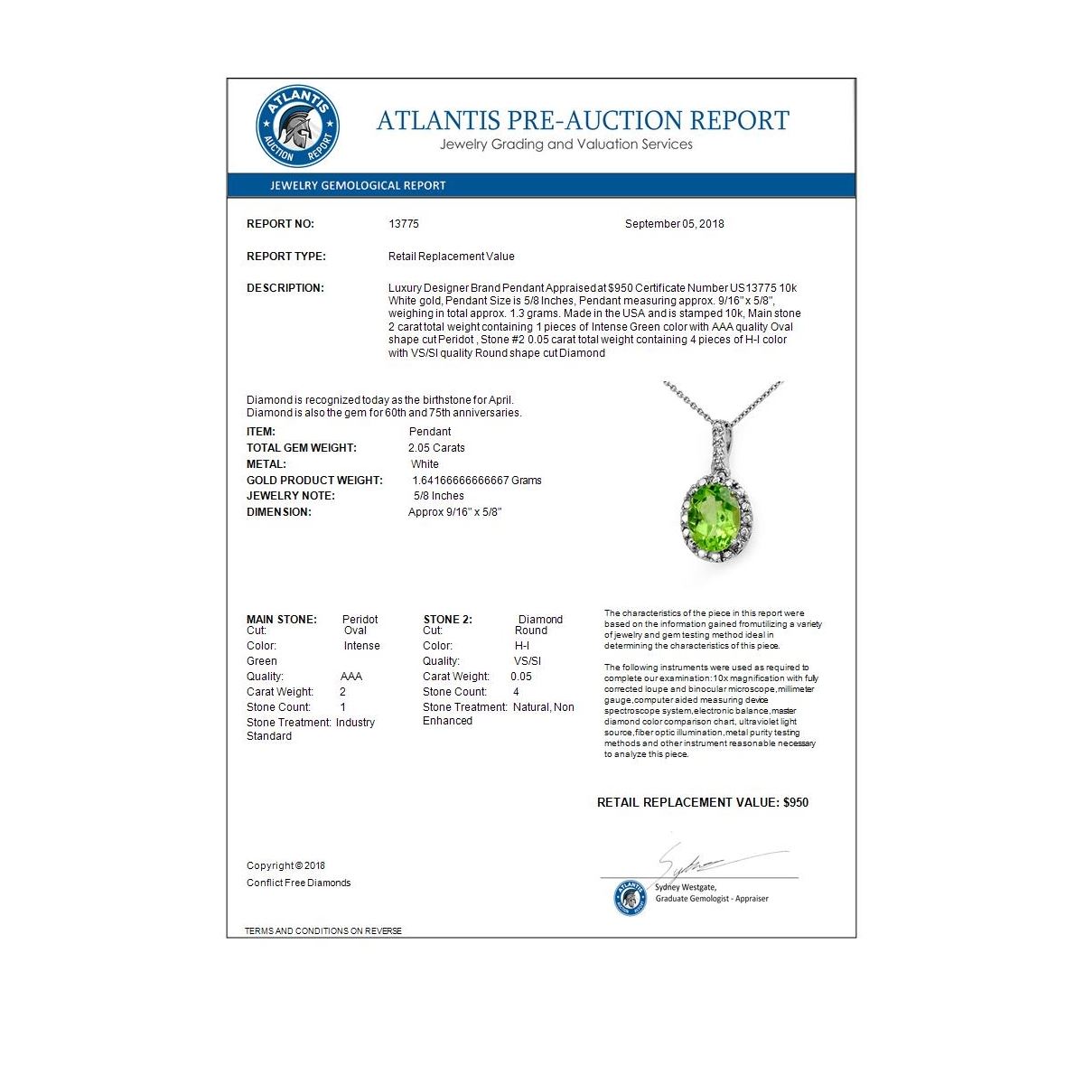 REF-13X5T -13775 ---- 2.05 CTW Peridot & Diamond Pendant 10K White Gold ---- Luxury Designer Brand Pendant Appraised at $950 Certificate Number US13775 10k White gold, Pendant Size is 5/8 Inches, Pendant measuring approx. 9/16" x 5/8", weighing in total approx. 1.3 grams. Made in the USA and is stamped 10k, Main stone 2 carat total weight containing 1 pieces of Intense Green color with AAA quality Oval shape cut Peridot , Stone #2 0.05 carat total weight containing 4 pieces of H-I color with VS/SI quality Round shape cut Diamond