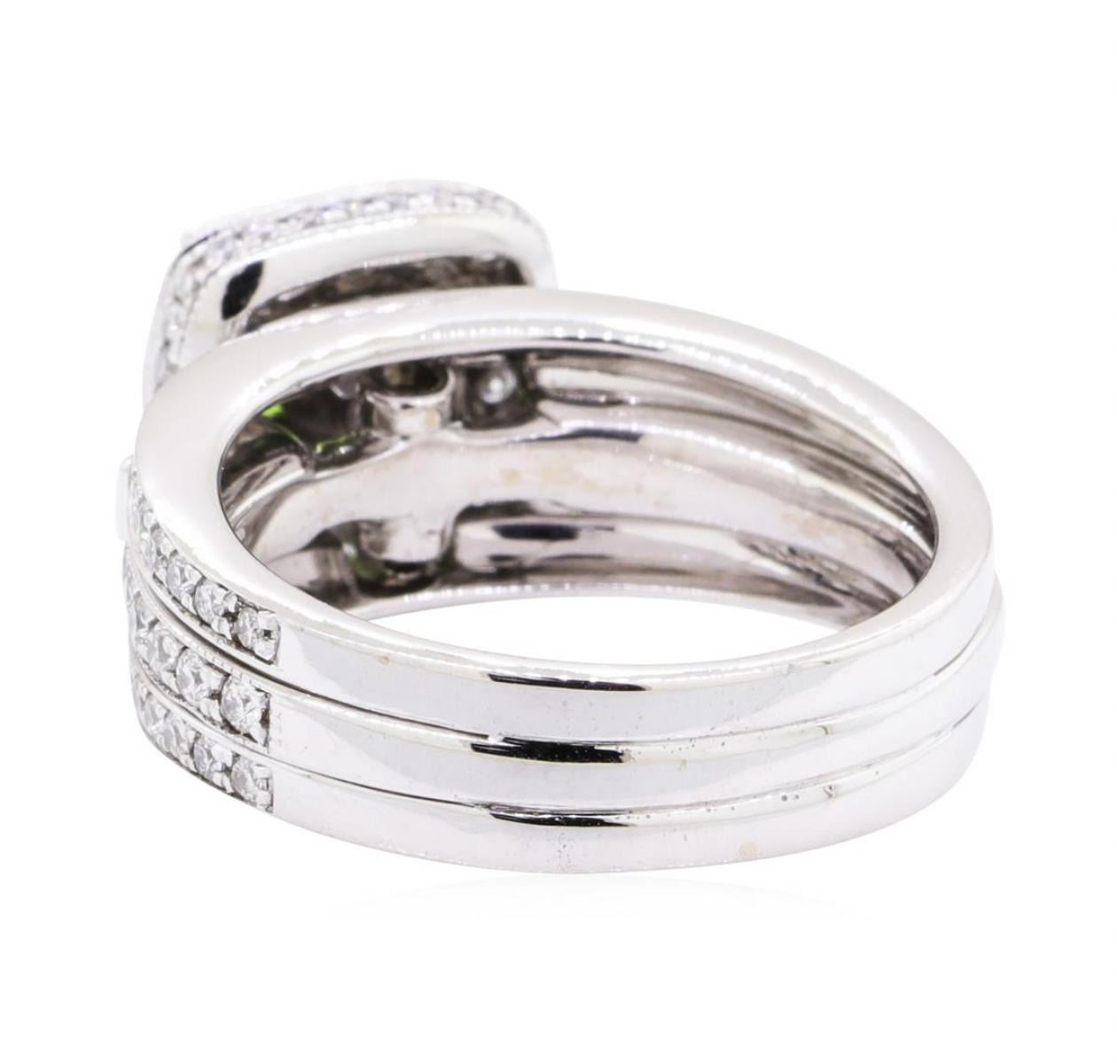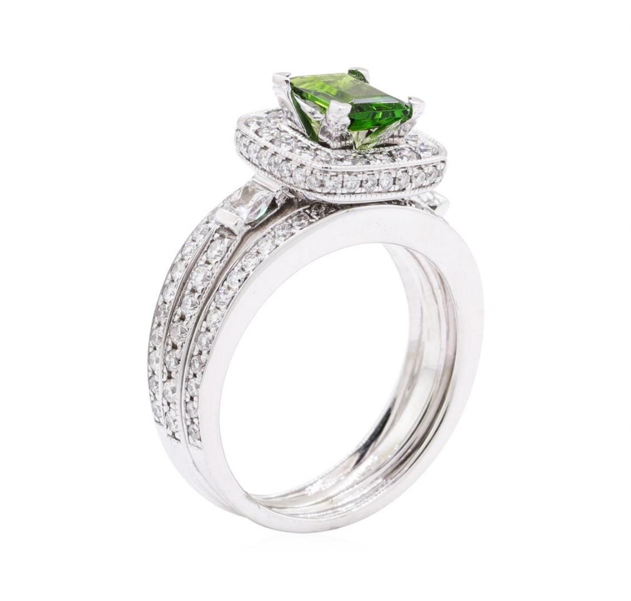 One electronically tested 14KT white gold lady's combination cast & assembled fashion ring with a triple split shank with halo with a bright polish with milgrain detailing finish. The featured lady's ring has a triple shank measuring 5.20 millimeters wide. Identified with markings of '14K'. Condition is new, good workmanship. Containing: One prong set emerald standard step cut natural apatite, measuring 7.11 x 5.01 x 2.90mm, (depth est.) approximate weight of 0.80 ct., clarity is eye clean, medium, strong, yellowish green color, (GIA yG 5/5), cut is good. Transmitting light with no distortion, transparent. Colored gemstones are presumed to have been subjected to commonly used enhancement processes. Graded in the setting. Two channel set princess cut diamonds, measuring 2.50 x 2.45 x 1.84mm (depth est.) approximate total weight of 2 Stones = 0.19ct. Graded in the setting. Color H Clarity VS-2 to SI-1 Cut Very Good Eighty prong set round brilliant cut diamonds, measuring 1.60 - 1.30 x 0.90mm (depth est.) approximate total weight of 80 Stones = 0.92ct. Graded in the setting. Color H - I Clarity VS-2 to SI-1 Cut Very Good Thirty-Two prong set round brilliant cut diamonds, measuring 1.10 - 1.00 x 0.65mm (depth est.) approximate total weight of 32 Stones = 0.14ct. Graded in the setting. Color H - I Clarity VS-2 to SI-1 Cut Very Good. Total Weight of Colored Stones 0.80 ct.. Total Weight of Diamonds 1.25ct.. Total Weight of Ring 8.60gm GAS Appraised at $5085.00. GAS Appraised.