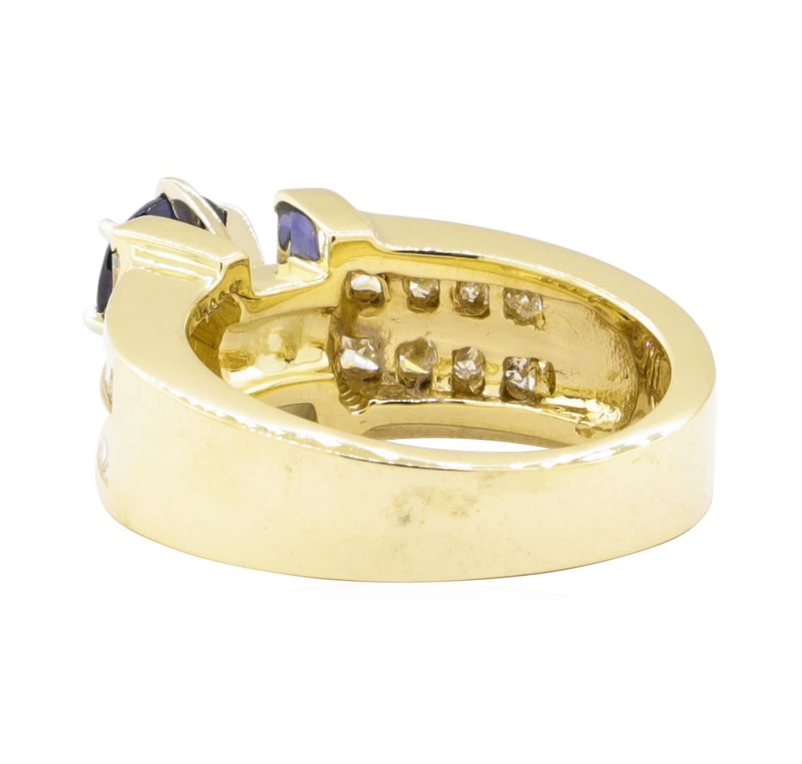 One electronically tested 14KT yellow gold lady's combination cast & assembled fashion ring with a double row cathedral shank with a bright polish finish. The featured lady's ring has a shank measuring 4.40 millimeters wide. Identified with markings of '14K'. Condition is new, good workmanship. Containing: One prong set round modified mixed cut natural blue sapphire, measuring 6.05 - 6.00 x 3.20 mm, (depth est.) approximate weight of 0.95ct., clarity is slightly included, medium dark, very slightly grayish, blue color, (GIA B 6/3), cut is good. Transmitting light with a minimum of distortion, transparent. Colored gemstones are presumed to have been subjected to commonly used enhancement processes. Graded in the setting. Four channel set baguette cut diamonds, measuring from 3.00 x 1.80 x 1.53mm (depth est.) to 3.10 x 1.85 x 1.57mm (depth est.) approximate total weight of 4 Stones = 0.32ct. Graded in the setting. Color H - I Clarity VS-1 to VS-2 Cut Very Good Twenty channel set princess cut diamonds, measuring 1.90 x 1.80 x 1.35mm (depth est.) approximate total weight of 20 Stones = 0.78ct. Graded in the setting. Color H - J Clarity VS-2 to SI-1 Cut Good. Total Weight of Colored Stones 0.95ct.. Total Weight of Diamonds 1.10ct.. Total Weight of Ring 9.00gm GAS Appraised at $4370.00. GAS Appraised.