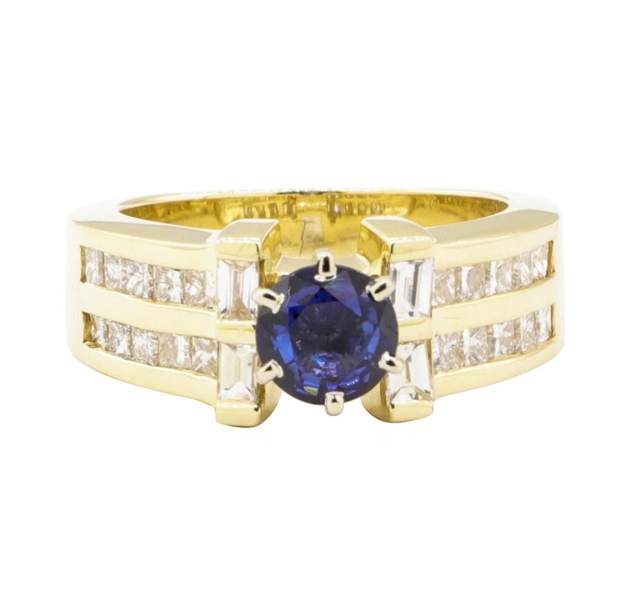 One electronically tested 14KT yellow gold lady's combination cast & assembled fashion ring with a double row cathedral shank with a bright polish finish. The featured lady's ring has a shank measuring 4.40 millimeters wide. Identified with markings of '14K'. Condition is new, good workmanship. Containing: One prong set round modified mixed cut natural blue sapphire, measuring 6.05 - 6.00 x 3.20 mm, (depth est.) approximate weight of 0.95ct., clarity is slightly included, medium dark, very slightly grayish, blue color, (GIA B 6/3), cut is good. Transmitting light with a minimum of distortion, transparent. Colored gemstones are presumed to have been subjected to commonly used enhancement processes. Graded in the setting. Four channel set baguette cut diamonds, measuring from 3.00 x 1.80 x 1.53mm (depth est.) to 3.10 x 1.85 x 1.57mm (depth est.) approximate total weight of 4 Stones = 0.32ct. Graded in the setting. Color H - I Clarity VS-1 to VS-2 Cut Very Good Twenty channel set princess cut diamonds, measuring 1.90 x 1.80 x 1.35mm (depth est.) approximate total weight of 20 Stones = 0.78ct. Graded in the setting. Color H - J Clarity VS-2 to SI-1 Cut Good. Total Weight of Colored Stones 0.95ct.. Total Weight of Diamonds 1.10 ct.. Total Weight of Ring 9.00gm GAS Appraised at $4370.00. GAS Appraised.