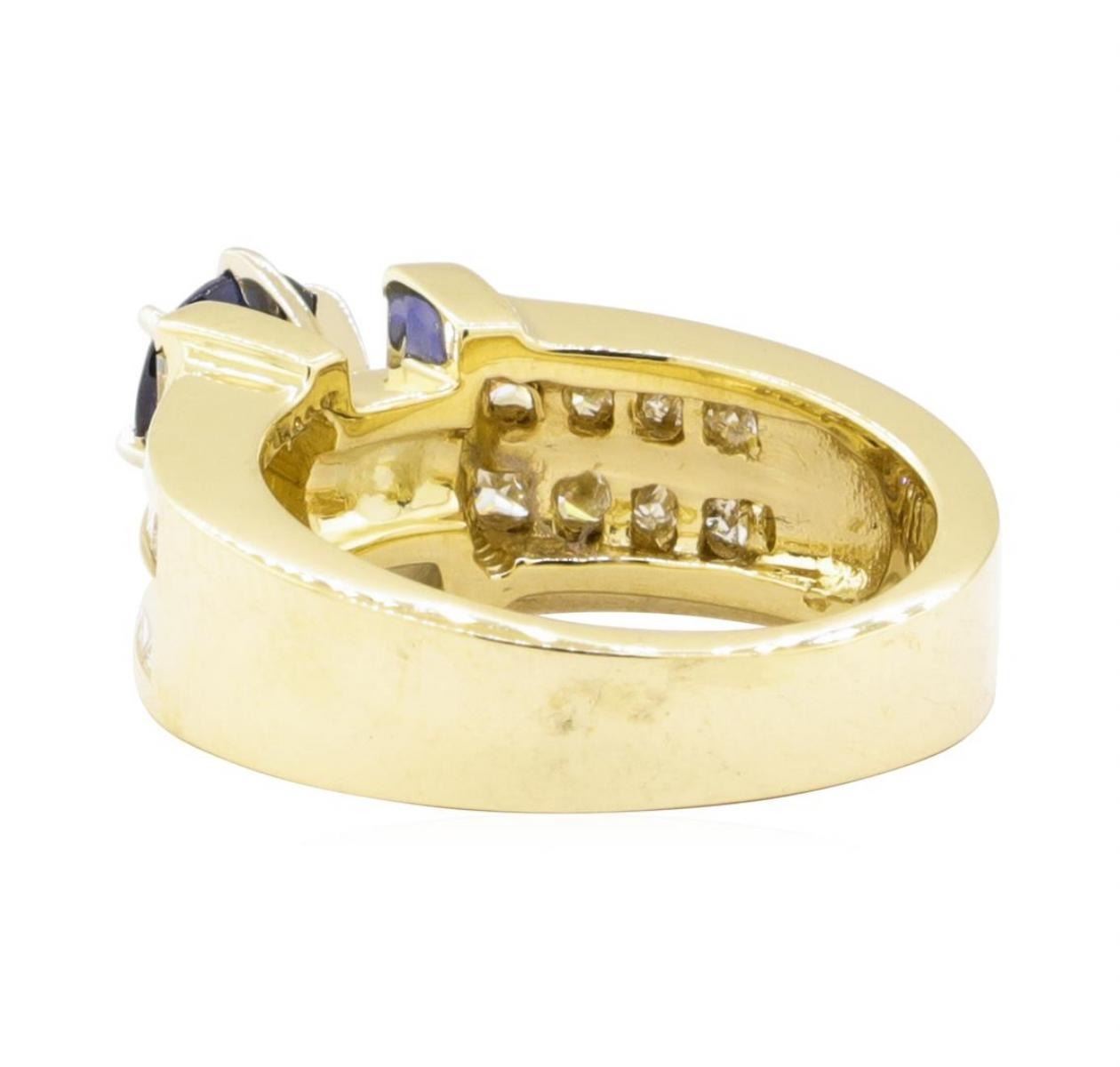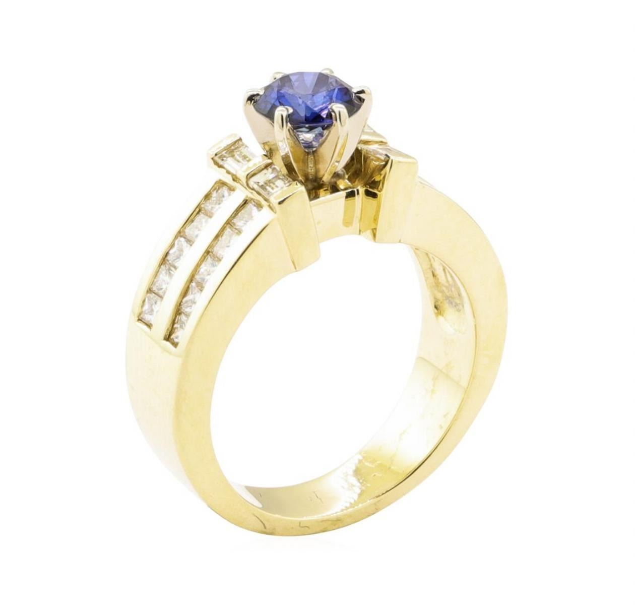 One electronically tested 14KT yellow gold lady's combination cast & assembled fashion ring with a double row cathedral shank with a bright polish finish. The featured lady's ring has a shank measuring 4.40 millimeters wide. Identified with markings of '14K'. Condition is new, good workmanship. Containing: One prong set round modified mixed cut natural blue sapphire, measuring 6.05 - 6.00 x 3.20 mm, (depth est.) approximate weight of 0.95ct., clarity is slightly included, medium dark, very slightly grayish, blue color, (GIA B 6/3), cut is good. Transmitting light with a minimum of distortion, transparent. Colored gemstones are presumed to have been subjected to commonly used enhancement processes. Graded in the setting. Four channel set baguette cut diamonds, measuring from 3.00 x 1.80 x 1.53mm (depth est.) to 3.10 x 1.85 x 1.57mm (depth est.) approximate total weight of 4 Stones = 0.32ct. Graded in the setting. Color H - I Clarity VS-1 to VS-2 Cut Very Good Twenty channel set princess cut diamonds, measuring 1.90 x 1.80 x 1.35mm (depth est.) approximate total weight of 20 Stones = 0.78ct. Graded in the setting. Color H - J Clarity VS-2 to SI-1 Cut Good. Total Weight of Colored Stones 0.95ct.. Total Weight of Diamonds 1.10 ct.. Total Weight of Ring 9.00gm GAS Appraised at $4370.00. GAS Appraised.