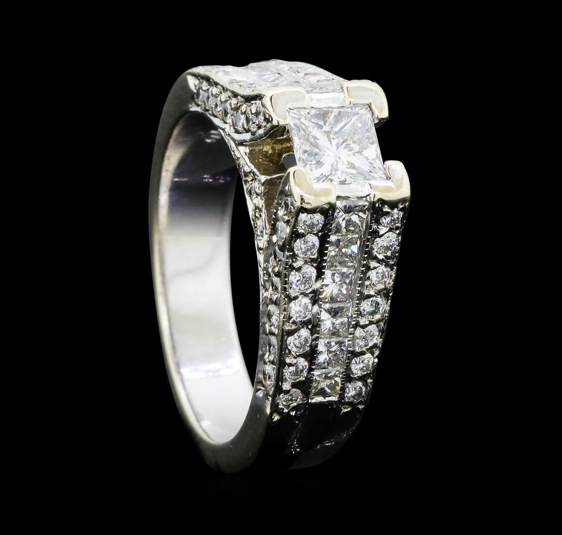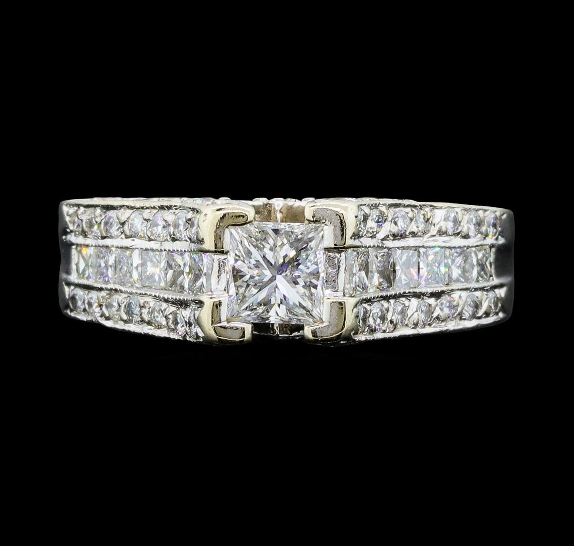 One electronically tested 14KT white gold lady's cast wedding ring with a cathedral channel with a bright polish with milgrain detailing finish. The featured lady's ring has a vintage motif and a shank measuring 4.30 millimeters wide. Identified with markings of '14K'. Condition is new, good workmanship. Containing: One prong set princess cut diamond, measuring 4.85 x 4.72 x 3.73mm (depth est.) approximate weight of 0.72ct. Graded in the setting. Color H Clarity SI-2 Cut Very Good Twelve channel set princess cut diamonds, measuring 2.30 x 2.00 x 1.50mm (depth est.) approximate total weight of 12 Stones = 0.68ct. Graded in the setting. Color H - I Clarity VS-2 to SI-1 Cut Very Good Sixty-Two bead set round brilliant cut diamonds, measuring 1.50 - 1.30 x 0.87mm (depth est.) approximate total weight of 62 Stones = 0.65ct. Graded in the setting. Color H - I Clarity SI-1 to SI-3 Cut Good. Total Weight of Diamonds 2.05ct.. Total Weight of Ring 8.50gm GAS Appraised at $8685.00. GAS Appraised at $8,685.00.