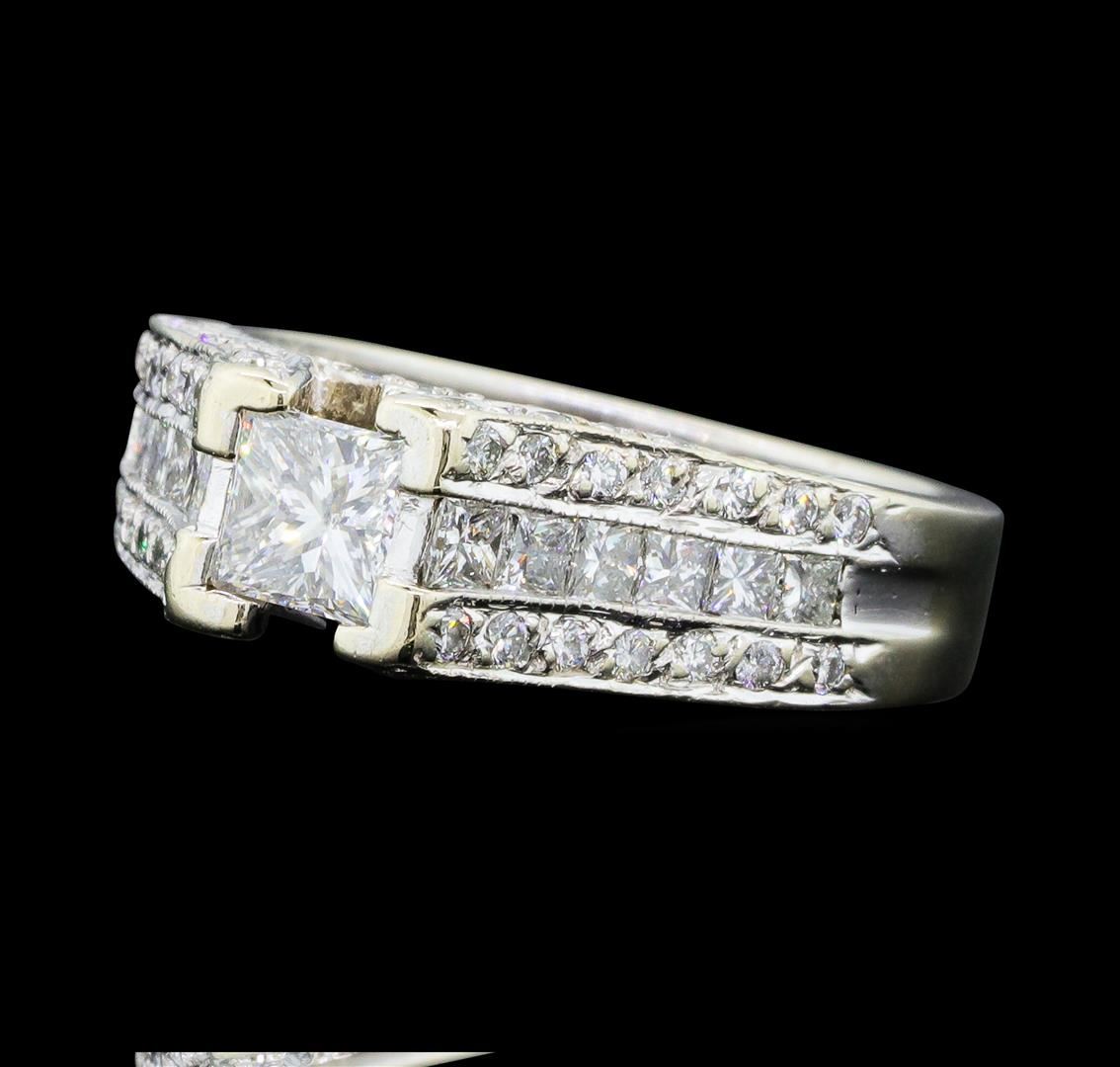 One electronically tested 14KT white gold lady's cast wedding ring with a cathedral channel with a bright polish with milgrain detailing finish. The featured lady's ring has a vintage motif and a shank measuring 4.30 millimeters wide. Identified with markings of '14K'. Condition is new, good workmanship. Containing: One prong set princess cut diamond, measuring 4.85 x 4.72 x 3.73mm (depth est.) approximate weight of 0.72ct. Graded in the setting. Color H Clarity SI-2 Cut Very Good Twelve channel set princess cut diamonds, measuring 2.30 x 2.00 x 1.50mm (depth est.) approximate total weight of 12 Stones = 0.68ct. Graded in the setting. Color H - I Clarity VS-2 to SI-1 Cut Very Good Sixty-Two bead set round brilliant cut diamonds, measuring 1.50 - 1.30 x 0.87mm (depth est.) approximate total weight of 62 Stones = 0.65ct. Graded in the setting. Color H - I Clarity SI-1 to SI-3 Cut Good. Total Weight of Diamonds 2.05ct.. Total Weight of Ring 8.50gm GAS Appraised at $8685.00. GAS Appraised at $8,685.00.