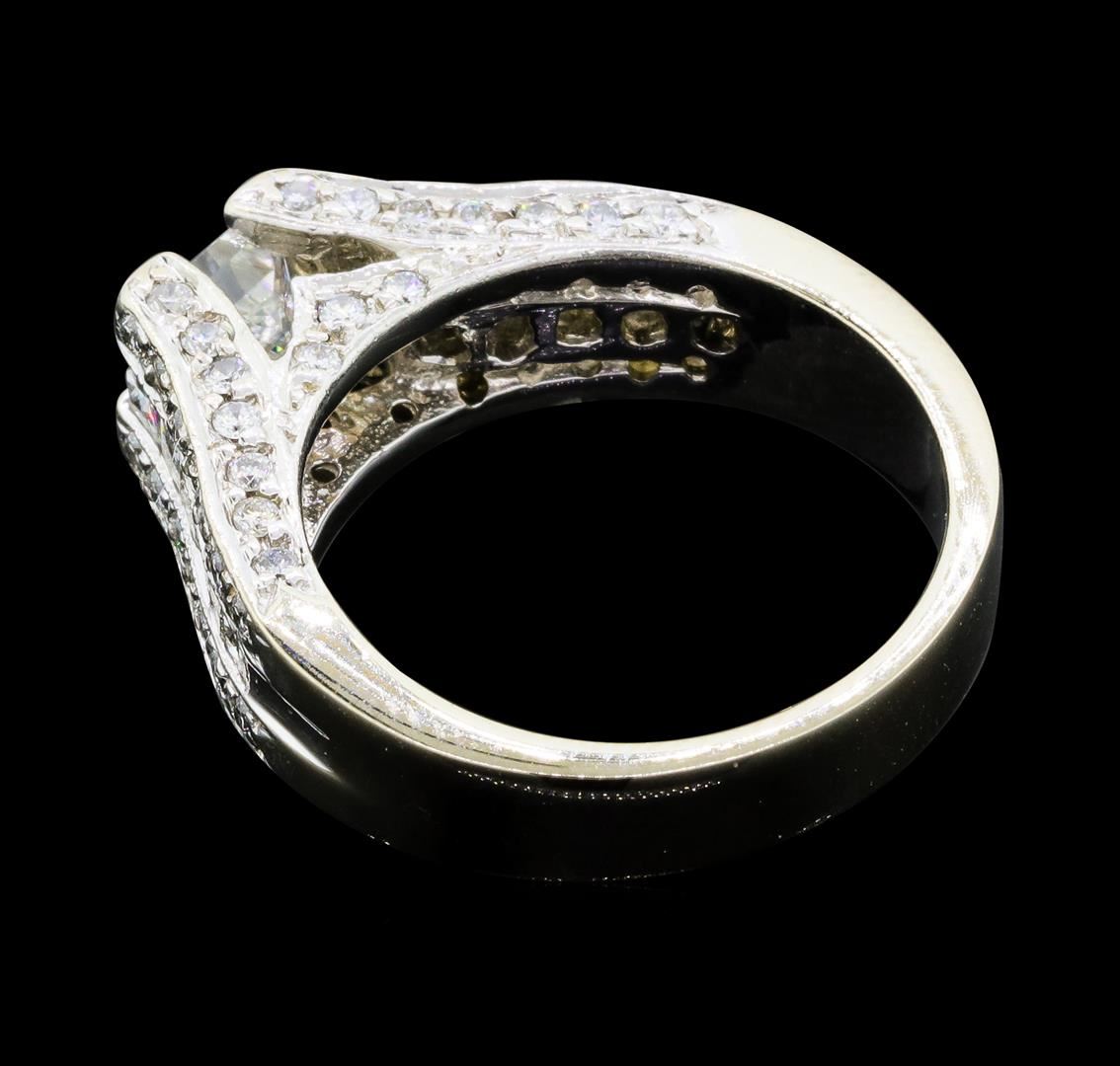 One electronically tested 14KT white gold lady's cast wedding ring with a cathedral channel with a bright polish with milgrain detailing finish. The featured lady's ring has a vintage motif and a shank measuring 4.30 millimeters wide. Identified with markings of '14K'. Condition is new, good workmanship. Containing: One prong set princess cut diamond, measuring 4.85 x 4.72 x 3.73mm (depth est.) approximate weight of 0.72ct. Graded in the setting. Color H Clarity SI-2 Cut Very Good Twelve channel set princess cut diamonds, measuring 2.30 x 2.00 x 1.50mm (depth est.) approximate total weight of 12 Stones = 0.68ct. Graded in the setting. Color H - I Clarity VS-2 to SI-1 Cut Very Good Sixty-Two bead set round brilliant cut diamonds, measuring 1.50 - 1.30 x 0.87mm (depth est.) approximate total weight of 62 Stones = 0.65ct. Graded in the setting. Color H - I Clarity SI-1 to SI-3 Cut Good. Total Weight of Diamonds 2.05ct.. Total Weight of Ring 8.50gm GAS Appraised at $8685.00. GAS Appraised at $8,685.00.