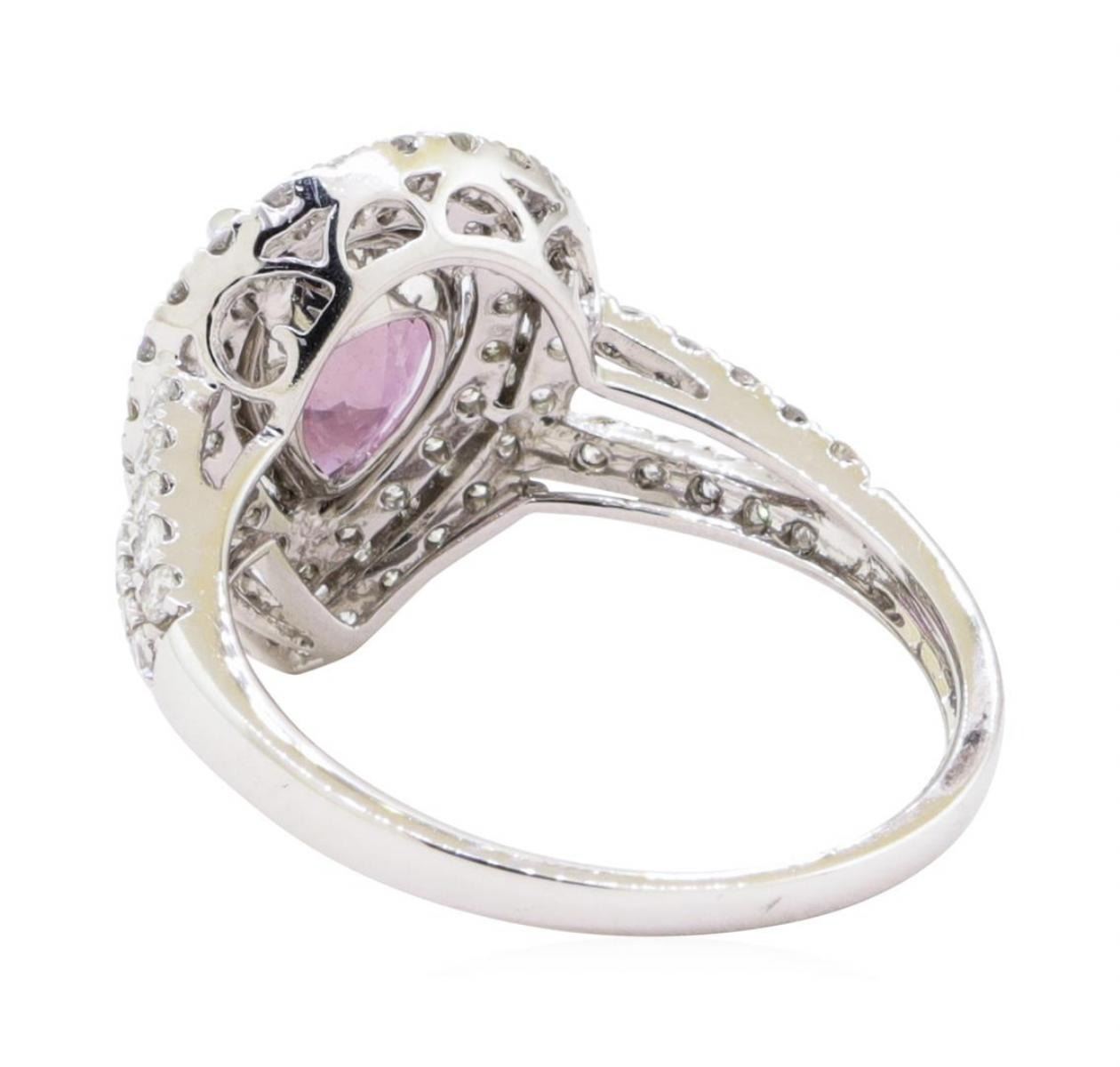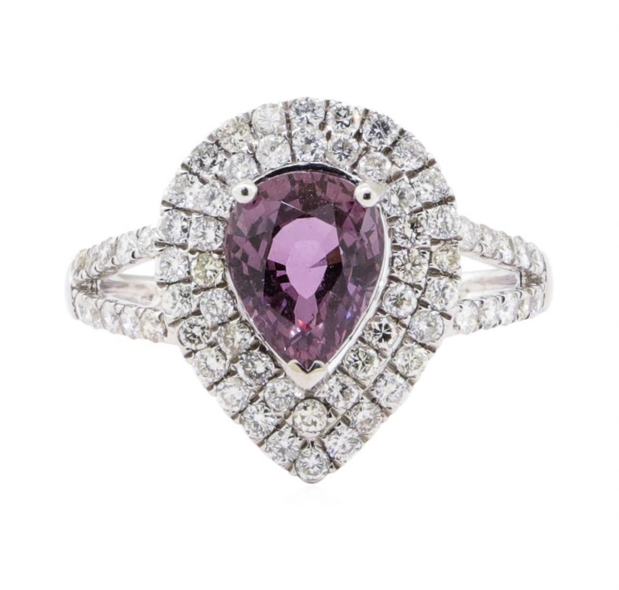 One electronically tested platinum ladies cast purple-pink sapphire and diamond ring with a bright polish finish.  The featured purple-pink sapphire is set within two tiered diamond bezels supported by diamond set split shoulders, completed by a one and one-half millimeter wide band.  Trademark is Orianne.  Identified with markings of "PT950". Condition is new, good workmanship. Containing: One prong set pear mixed cut natural purple-pink sapphire, measuring 8.57 x 6.61 x 4.64mm,  exact weight 2.05ct.  Clarity is slightly included, medium dark, very slightly grayish, purple-pink color, (GIA PPi 6/3), cut is good. Transmitting light with a minimum of distortion, transparent. Naturally occurring internal & external characteristics are present. No indications of heating. GIA Gemological Report attached. Graded loose prior to setting in the GIA Laboratory, Report #5181163853. Sixty-Six prong set round brilliant cut diamonds approximate total weight of 66 Stones = 0.83ct.  Graded in the setting. Clarity VS-2 to SI-1 Color G - I Total Weight of Colored Stones   2.05 ct. Total Weight of Diamonds 0.83 ct. Total Weight of Ring 5.14 gm Estimated Retail Value $    14,660.00 US