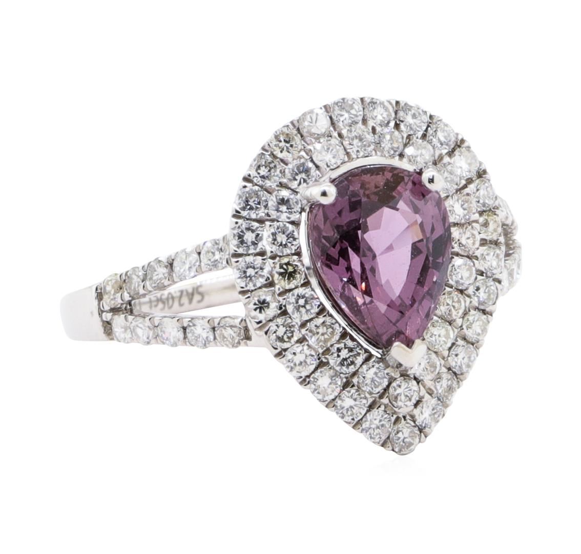 One electronically tested platinum ladies cast purple-pink sapphire and diamond ring with a bright polish finish. The featured purple-pink sapphire is set within two tiered diamond bezels supported by diamond set split shoulders, completed by a one and one-half millimeter wide band. Trademark is Orianne. Identified with markings of "PT950". Condition is new, good workmanship. Containing: One prong set pear mixed cut natural purple-pink sapphire, measuring 8.57 x 6.61 x 4.64mm, exact weight 2.05ct. Clarity is slightly included, medium dark, very slightly grayish, purple-pink color, (GIA PPi 6/3), cut is good. Transmitting light with a minimum of distortion, transparent. Naturally occurring internal & external characteristics are present. No indications of heating. GIA Gemological Report attached. Graded loose prior to setting in the GIA Laboratory, Report #5181163853. Sixty-Six prong set round brilliant cut diamonds approximate total weight of 66 Stones = 0.83ct. Graded in the setting. Clarity VS-2 to SI-1 Color G - I Total Weight of Colored Stones 2.05 ct. Total Weight of Diamonds 0.83 ct. Total Weight of Ring 5.14 gm Estimated Retail Value $ 14,660.00 US