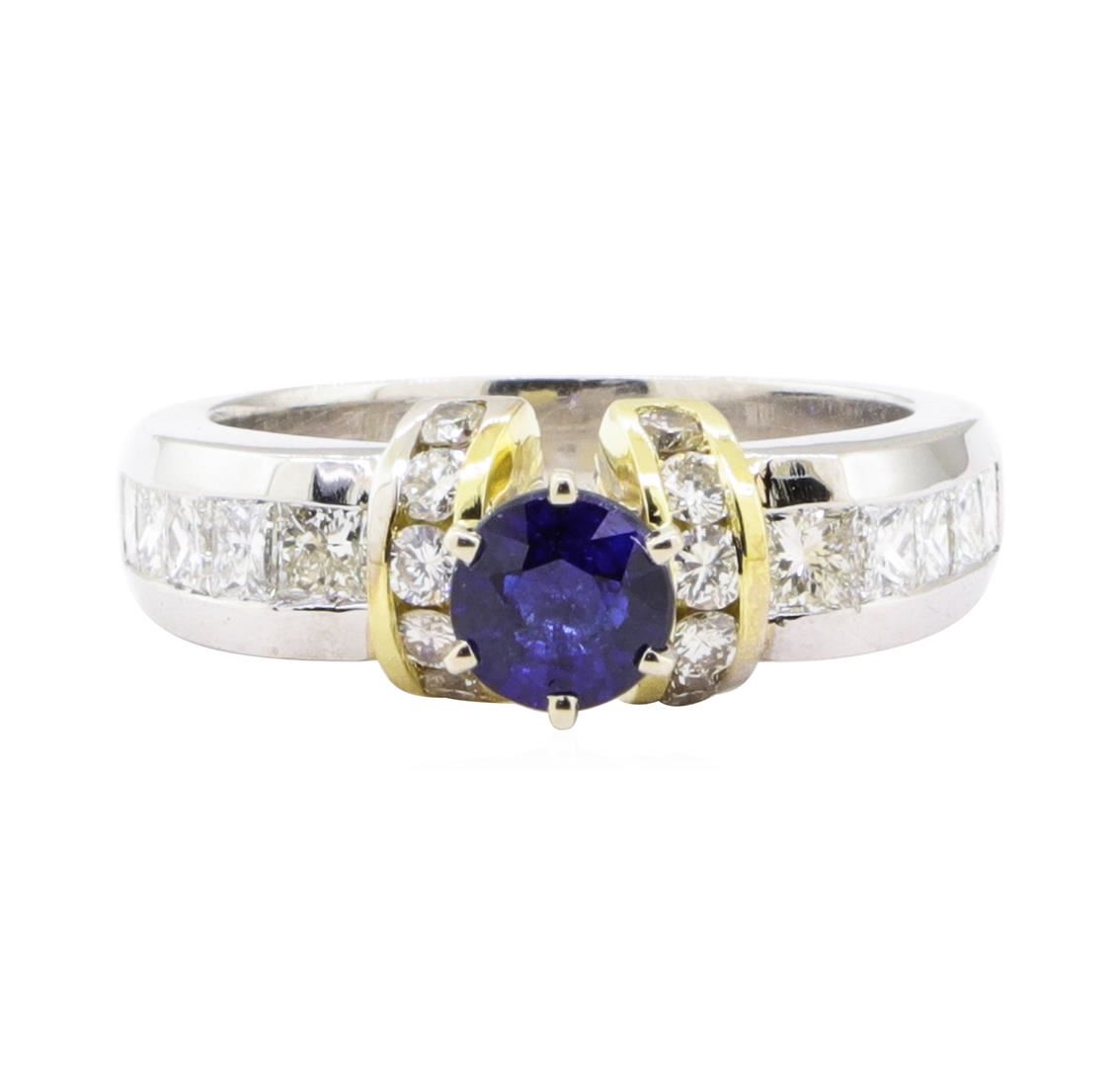 One electronically tested 18KT-platinum yellow gold lady's combination cast & assembled fashion ring with a straight line with cuffs with a bright polish finish. The featured lady's ring has a shank measuring 3.65 millimeters wide. Identified with markings of '18K / PLTM'. Condition is Good. Containing: One prong set round modified mixed cut natural blue sapphire, measuring 5.42 - 5.35 x 3.50 mm, (depth est.) approximate weight of 0.85ct., clarity is slightly included, medium dark, moderately strong, violetish blue color, (GIA vB 6/4), cut is good. Transmitting light with a minimum of distortion, transparent. Colored gemstones are presumed to have been subjected to commonly used enhancement processes. Graded in the setting. Ten channel set princess cut diamonds, measuring 2.50 x 2.40 x 1.80mm (depth est.) approximate total weight of 10 Stones = 0.90ct. Graded in the setting. Color H - I Clarity VS-1 to VS-2 Cut Very Good Ten channel set round brilliant cut diamonds, measuring 2.00 - 1.90 x 1.21mm (depth est.) approximate total weight of 10 Stones = 0.30ct. Graded in the setting. Color H - I Clarity VS-2 to SI-1 Cut Very Good. Total Weight of Colored Stones 0.85ct.. Total Weight of Diamonds 1.20ct.. Total Weight of Ring 10.90gm GAS Appraised at $5875.00. GAS Appraised.