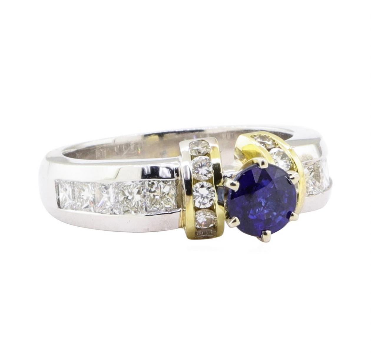 One electronically tested 18KT-platinum yellow gold lady's combination cast & assembled fashion ring with a straight line with cuffs with a bright polish finish. The featured lady's ring has a shank measuring 3.65 millimeters wide. Identified with markings of '18K / PLTM'. Condition is Good. Containing: One prong set round modified mixed cut natural blue sapphire, measuring 5.42 - 5.35 x 3.50 mm, (depth est.) approximate weight of 0.85ct., clarity is slightly included, medium dark, moderately strong, violetish blue color, (GIA vB 6/4), cut is good. Transmitting light with a minimum of distortion, transparent. Colored gemstones are presumed to have been subjected to commonly used enhancement processes. Graded in the setting. Ten channel set princess cut diamonds, measuring 2.50 x 2.40 x 1.80mm (depth est.) approximate total weight of 10 Stones = 0.90ct. Graded in the setting. Color H - I Clarity VS-1 to VS-2 Cut Very Good Ten channel set round brilliant cut diamonds, measuring 2.00 - 1.90 x 1.21mm (depth est.) approximate total weight of 10 Stones = 0.30ct. Graded in the setting. Color H - I Clarity VS-2 to SI-1 Cut Very Good. Total Weight of Colored Stones 0.85ct.. Total Weight of Diamonds 1.20ct.. Total Weight of Ring 10.90gm GAS Appraised at $5875.00. GAS Appraised.