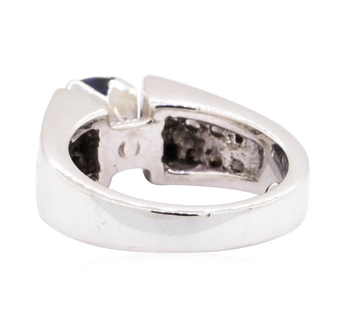 One electronically tested platinum lady's combination cast & assembled fashion ring with a tapered cathedral shank with a bright polish finish. The featured lady's ring has sizing balls and a shank measuring 3.30 millimeters wide. Identified with markings of 'PLAT'. Condition is like new, good workmanship. Containing: One prong set rectangular cushion modified mixed cut natural blue sapphire, measuring 6.69 x 5.30 x 3.25mm, (depth est.) approximate weight of 1.05ct., clarity is slightly included, medium dark, moderately strong, blue color, (GIA B 6/4), cut is good. Transmitting light with a minimum of distortion, transparent. Colored gemstones are presumed to have been subjected to commonly used enhancement processes. Graded in the setting. Sixteen channel set princess cut diamonds, measuring 2.30 x 2.00 x 1.50mm (depth est.) approximate total weight of 16 Stones = 1.00ct. Graded in the setting. Color G - H Clarity SI-1 to SI-2 Cut Very Good. Total Weight of Colored Stones 1.05ct.. Total Weight of Diamonds 1.00ct.. Total Weight of Ring 12.30gm GAS Appraised at  $5270.00. GAS Appraised at $5,270.00.